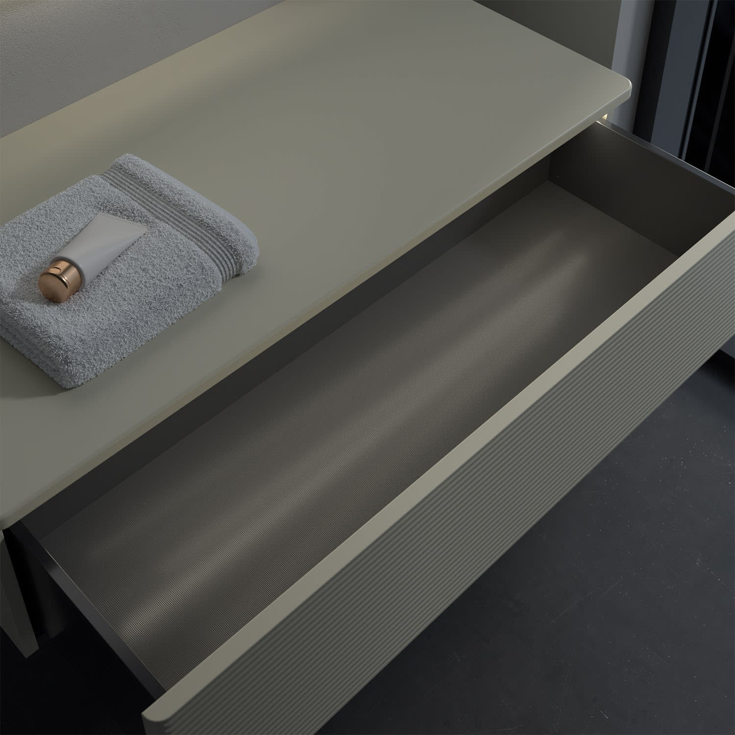 - kein Umfallen oder Verrutschen von Pflegeprodukten in den Schubladen dank rutschhemmendem Boden