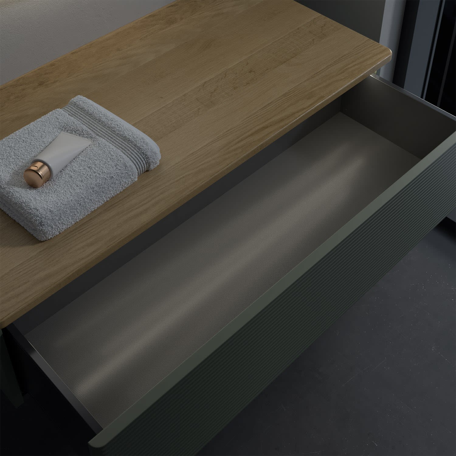 - kein Umfallen oder Verrutschen von Pflegeprodukten in den Schubladen dank rutschhemmendem Boden