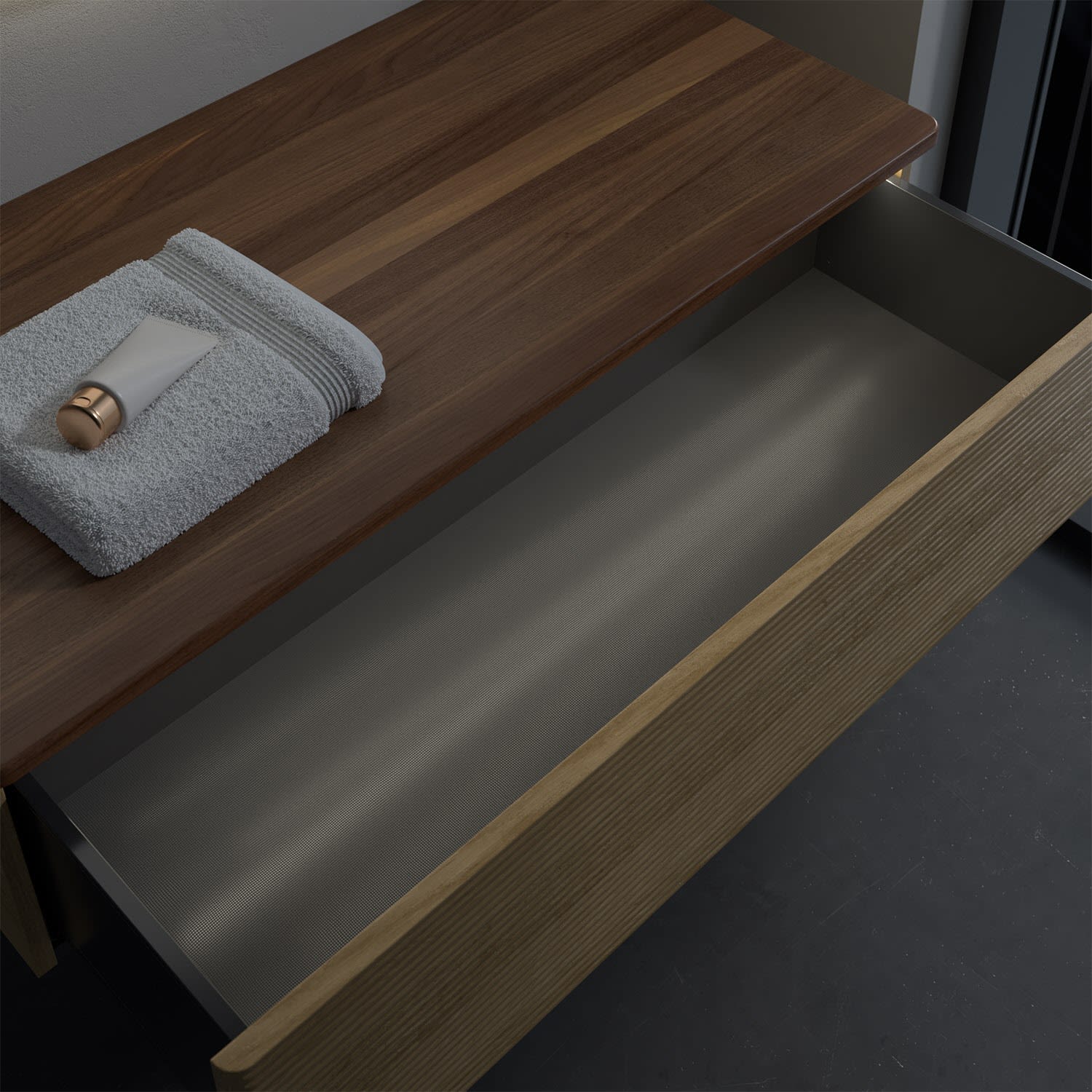 - kein Umfallen oder Verrutschen von Pflegeprodukten in den Schubladen dank rutschhemmendem Boden