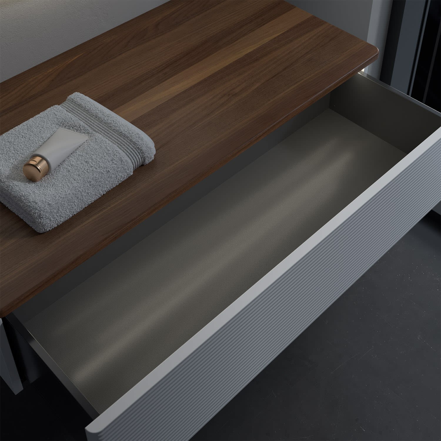 - kein Umfallen oder Verrutschen von Pflegeprodukten in den Schubladen dank rutschhemmendem Boden