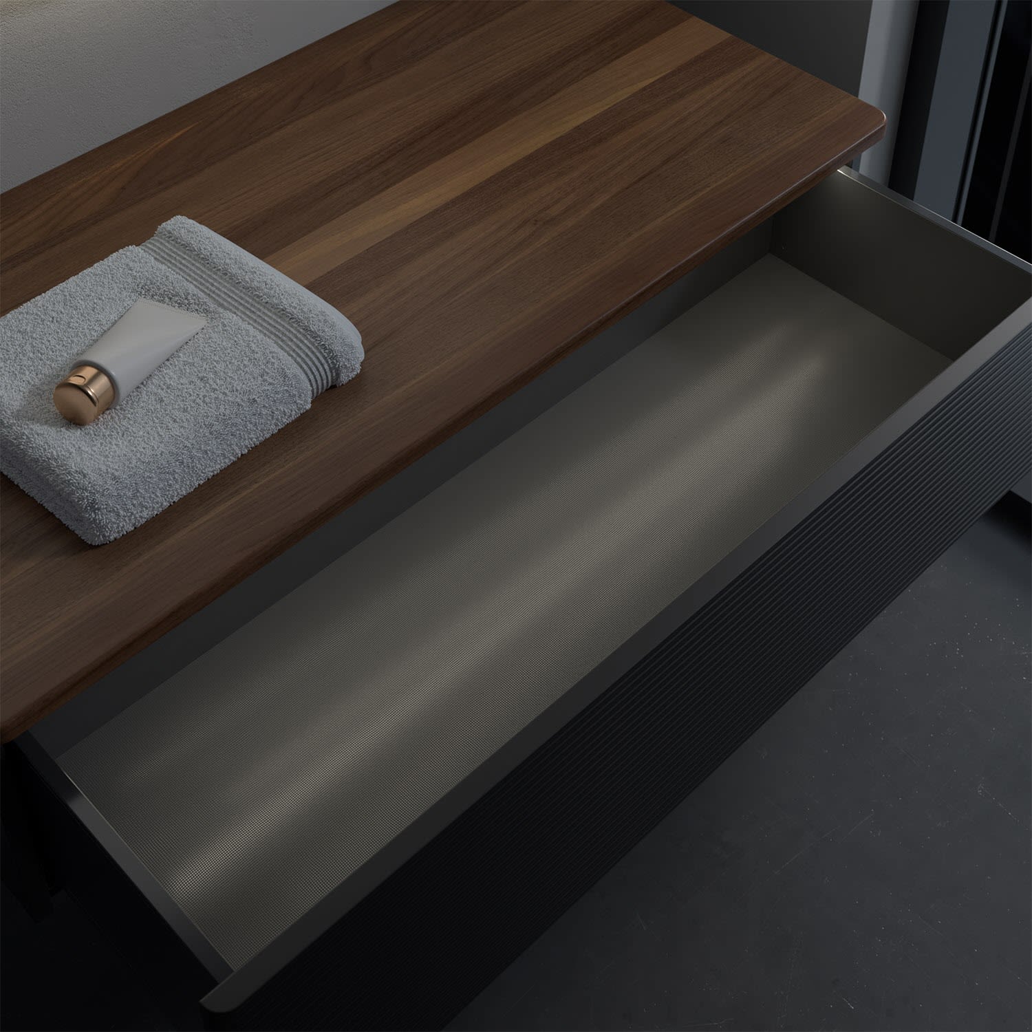 - kein Umfallen oder Verrutschen von Pflegeprodukten in den Schubladen dank rutschhemmendem Boden