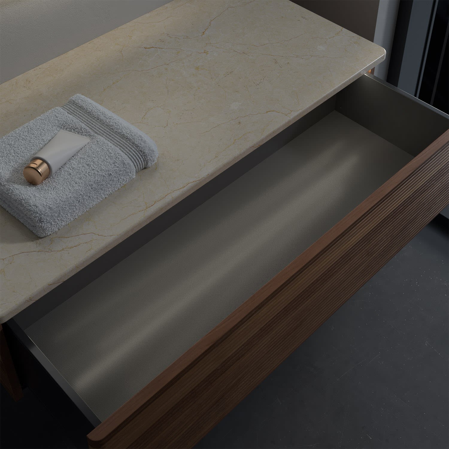 - kein Umfallen oder Verrutschen von Pflegeprodukten in den Schubladen dank rutschhemmendem Boden