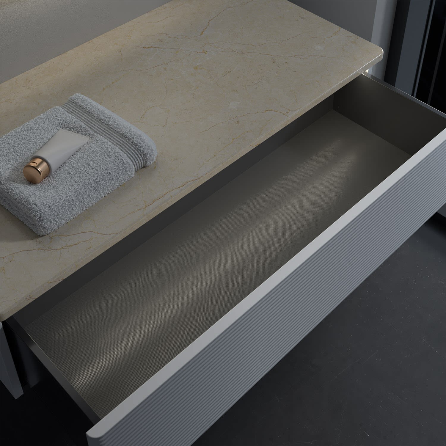 - kein Umfallen oder Verrutschen von Pflegeprodukten in den Schubladen dank rutschhemmendem Boden