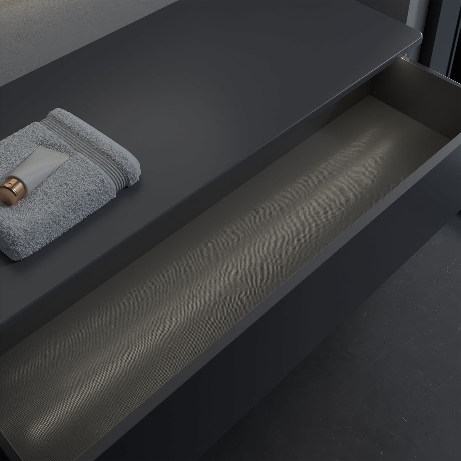Ein hochwertiges Badmöbel von Villeroy & Boch mit sanfter Formsprache durch abgerundete Kanten: Das wandhängende Sideboard der Kollektion Antao bietet eine ideale Stauraummöglichkeit im Badezimmer und ist auch optisch ein Blickfang. Es verfügt über einen grifflosen Auszug mit Push-to-Open Funktion. Er lässt sich in seiner vollen Tiefe öffnen und ermöglicht so großzügigen Stauraum für diverse Utensilien, über die man nicht den Überblick verliert. Erst recht nicht, dank der eingebauten LED-Beleuchtung, die sich automatisch beim Öffnen einschaltet. Der integrierte Antirutschboden sorgt dafür, dass der Inhalt sicher und fest steht. Handtücher oder auch Dekoartikel finden auf der Ablagefläche bequem ihren Platz. Für eine besonders leichte Pflege sorgt die mehrschichtig deckend lackierte Oberfläche.