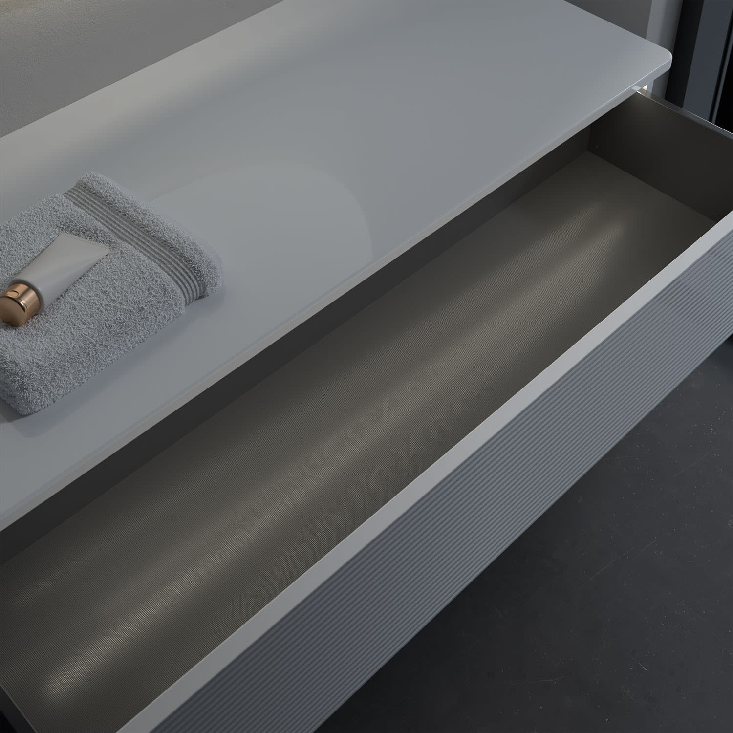- kein Umfallen oder Verrutschen von Pflegeprodukten in den Schubladen dank rutschhemmendem Boden