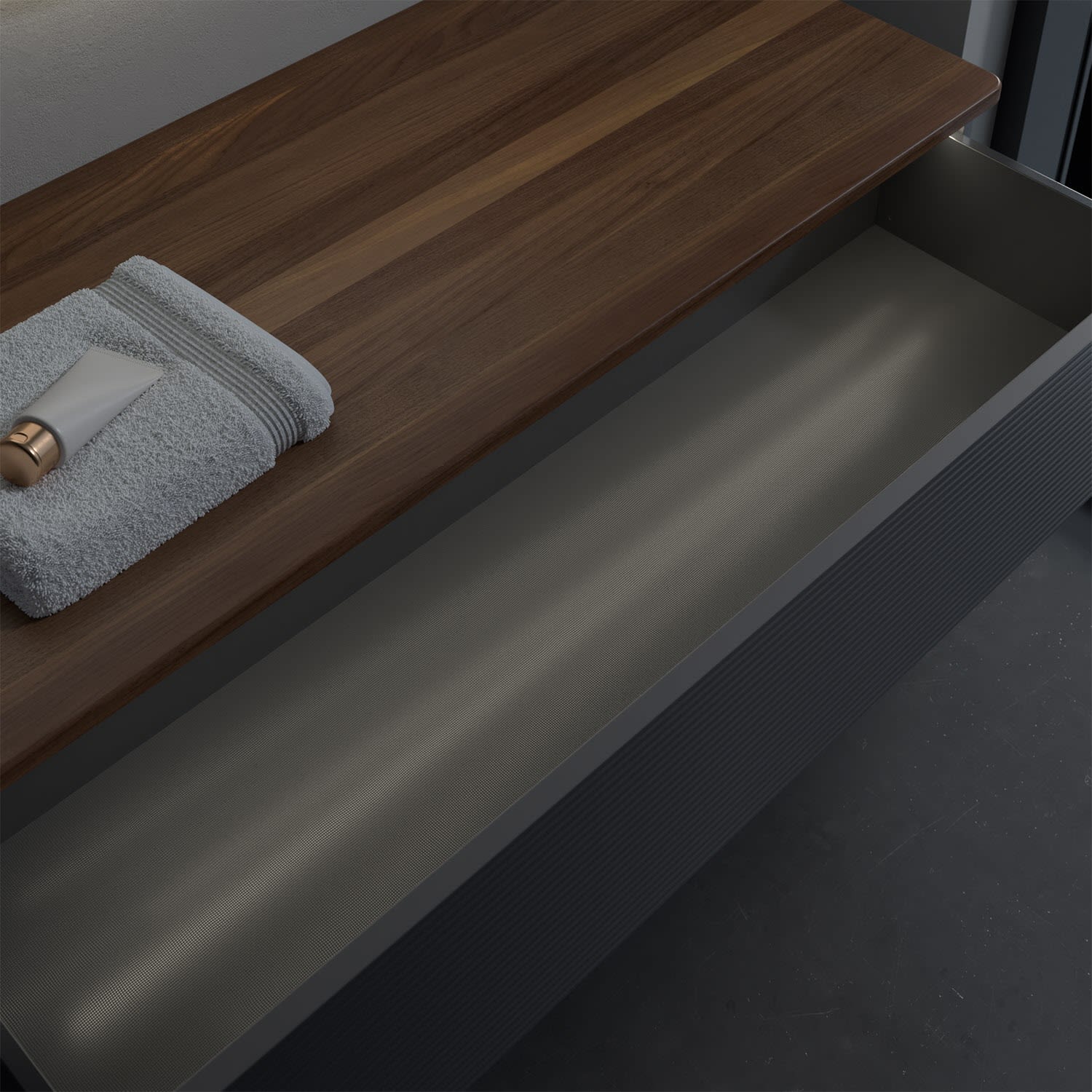 - kein Umfallen oder Verrutschen von Pflegeprodukten in den Schubladen dank rutschhemmendem Boden