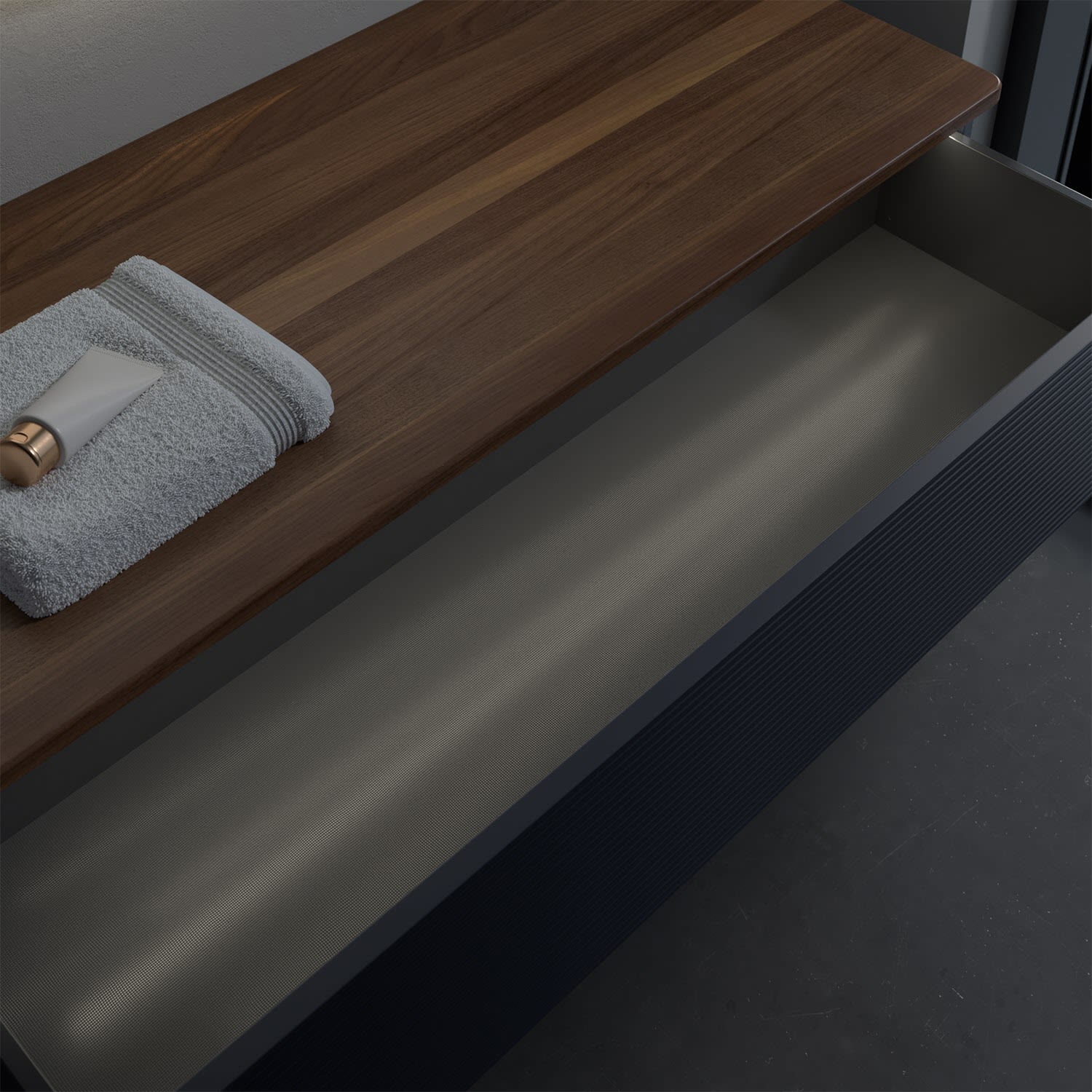 - kein Umfallen oder Verrutschen von Pflegeprodukten in den Schubladen dank rutschhemmendem Boden