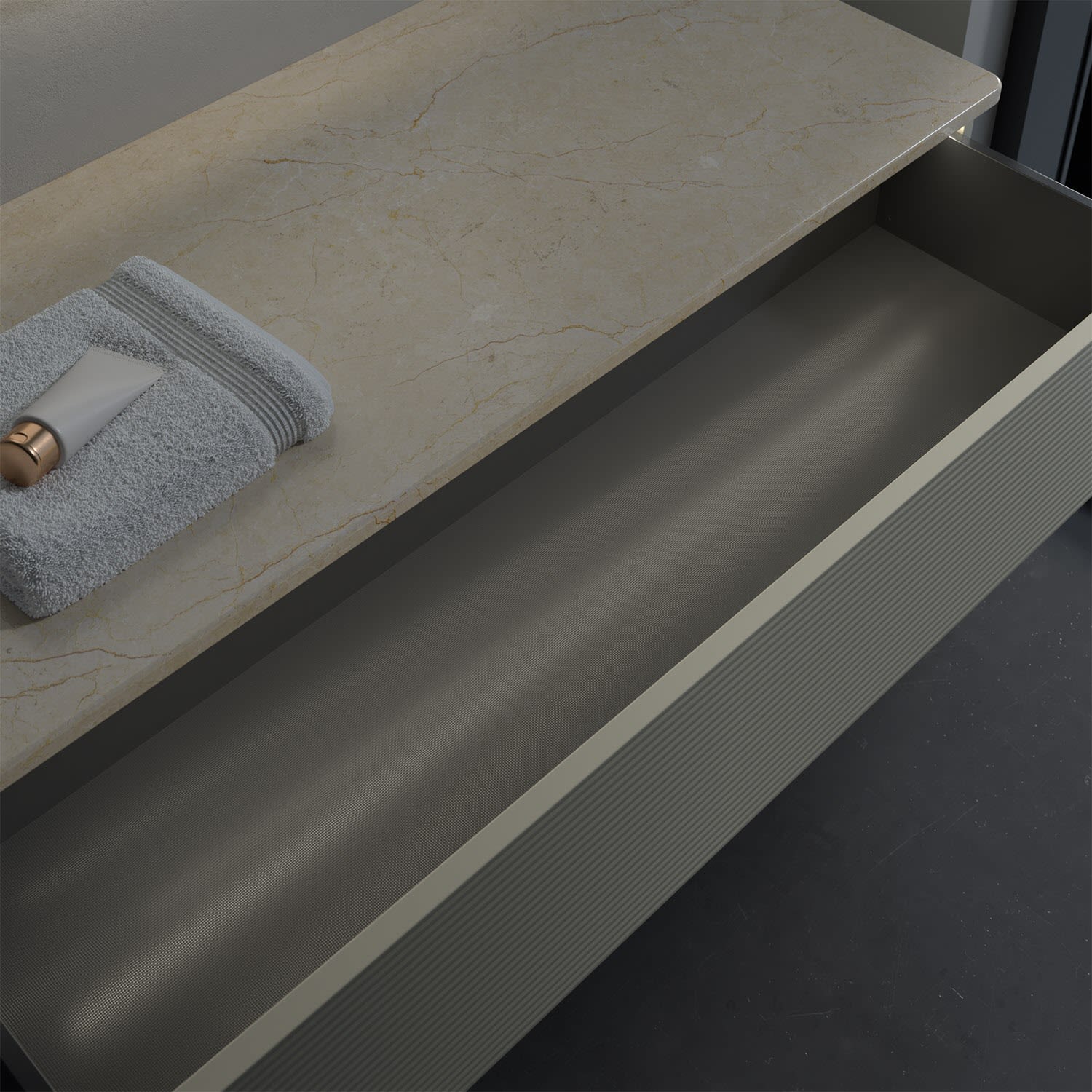 Ein hochwertiges Badmöbel von Villeroy & Boch mit sanfter Formsprache durch abgerundete Kanten: Das wandhängende Sideboard der Kollektion Antao bietet eine ideale Stauraummöglichkeit im Badezimmer und ist auch optisch ein Blickfang. Es verfügt über einen grifflosen Auszug mit strukturierter Front und Push-to-Open Funktion. Er lässt sich in seiner vollen Tiefe öffnen und ermöglicht so großzügigen Stauraum für diverse Utensilien, über die man nicht den Überblick verliert. Erst recht nicht, dank der eingebauten LED-Beleuchtung, die sich automatisch beim Öffnen einschaltet. Der integrierte Antirutschboden sorgt dafür, dass der Inhalt sicher und fest steht. Handtücher oder auch Dekoartikel finden auf der Ablagefläche bequem ihren Platz. Für eine besonders leichte Pflege sorgt die mehrschichtig deckend lackierte Oberfläche. Bei der Ausführung in Massivholz wird dank des verarbeiteten Massivholzes jedes Möbel zu einem Unikat, das sich durch das lebendige Naturmaterial durch seine einzigartige Struktur und Maserung auszeichnet.