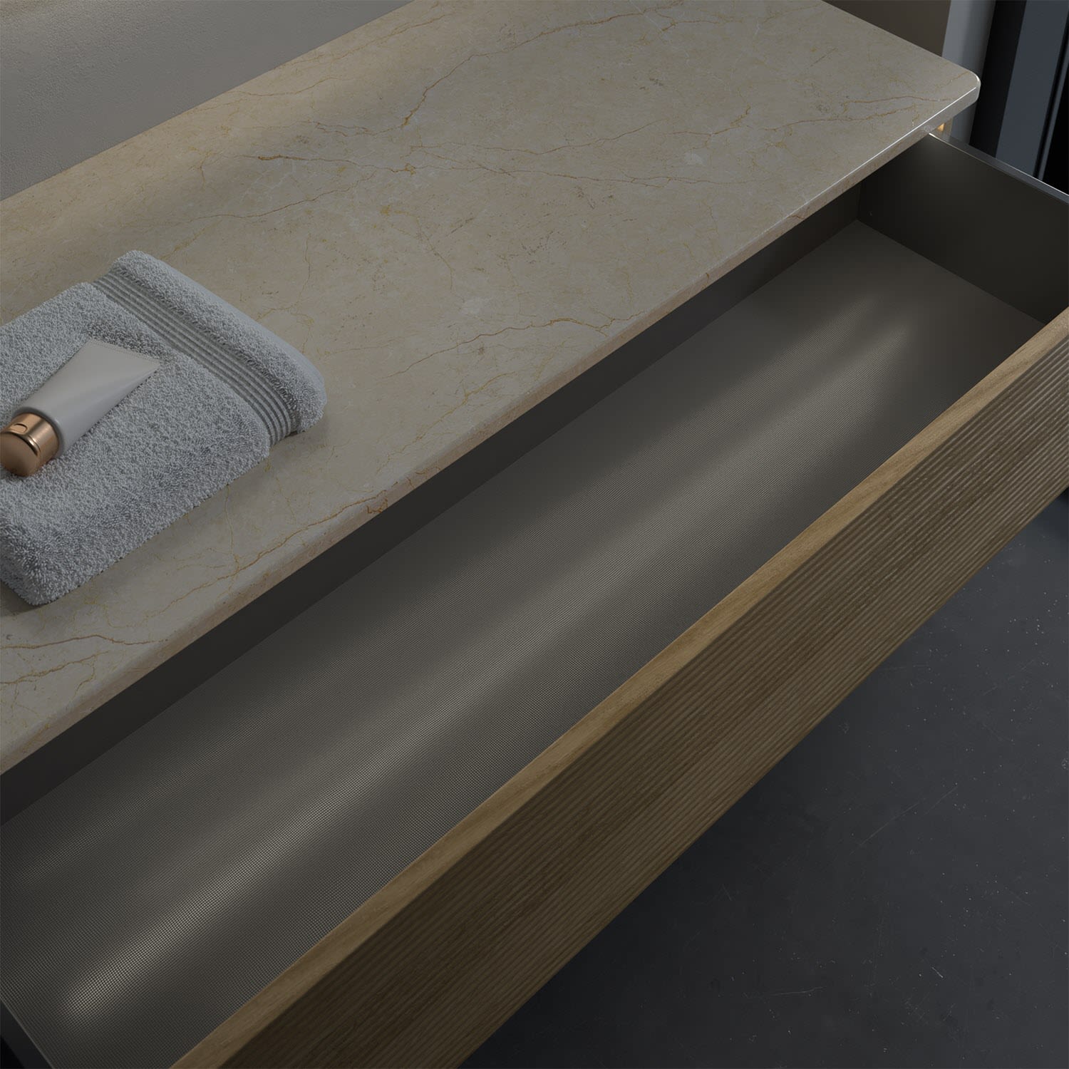 - kein Umfallen oder Verrutschen von Pflegeprodukten in den Schubladen dank rutschhemmendem Boden
