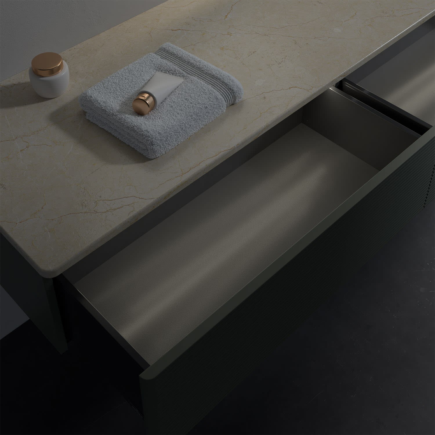 - kein Umfallen oder Verrutschen von Pflegeprodukten in den Schubladen dank rutschhemmendem Boden