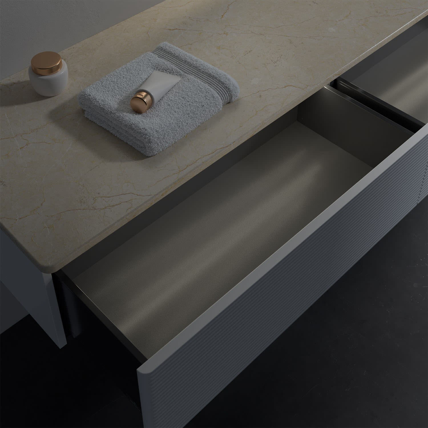 - kein Umfallen oder Verrutschen von Pflegeprodukten in den Schubladen dank rutschhemmendem Boden