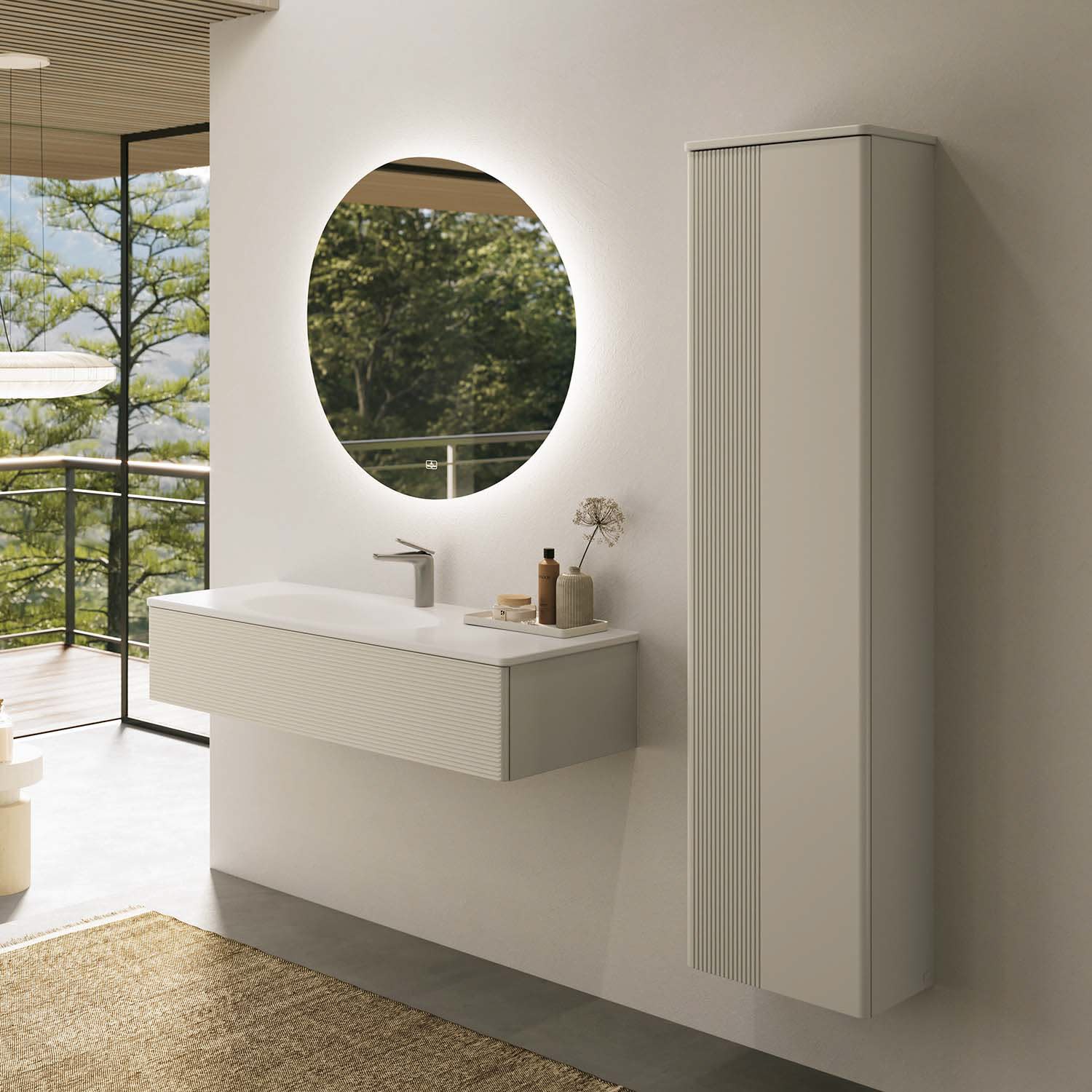 Der wandhängende Antao Hochschrank von Villeroy & Boch ist eine hochwertige, moderne Lösung für Ordnung und Stauraum im Badezimmer. Hinter der sich nach links öffnenden Tür befindet sich auf einem fixen Fachboden und drei verstellbaren Glaseinlegeböden jede Menge Platz für Badutensilien wie Handtücher, Kosmetik, Badezusatz und vieles mehr. Die asymmetrisch strukturierte Front mit den sanft abgerundeten Kanten unterstreicht den schlichten, zeitlosen Look und macht das Öffnen zum haptischen Erlebnis. Eingebaute Dämpfer sorgen für ein angenehmes, leises Schließen der Tür. Für eine besonders leichte Pflege sorgt die mehrschichtig deckend lackierte Oberfläche. Bei der Ausführung in Massivholz wird dank des verarbeiteten Massivholzes jedes Möbel zu einem Unikat, das sich durch das lebendige Naturmaterial durch seine einzigartige Struktur und Maserung auszeichnet.
