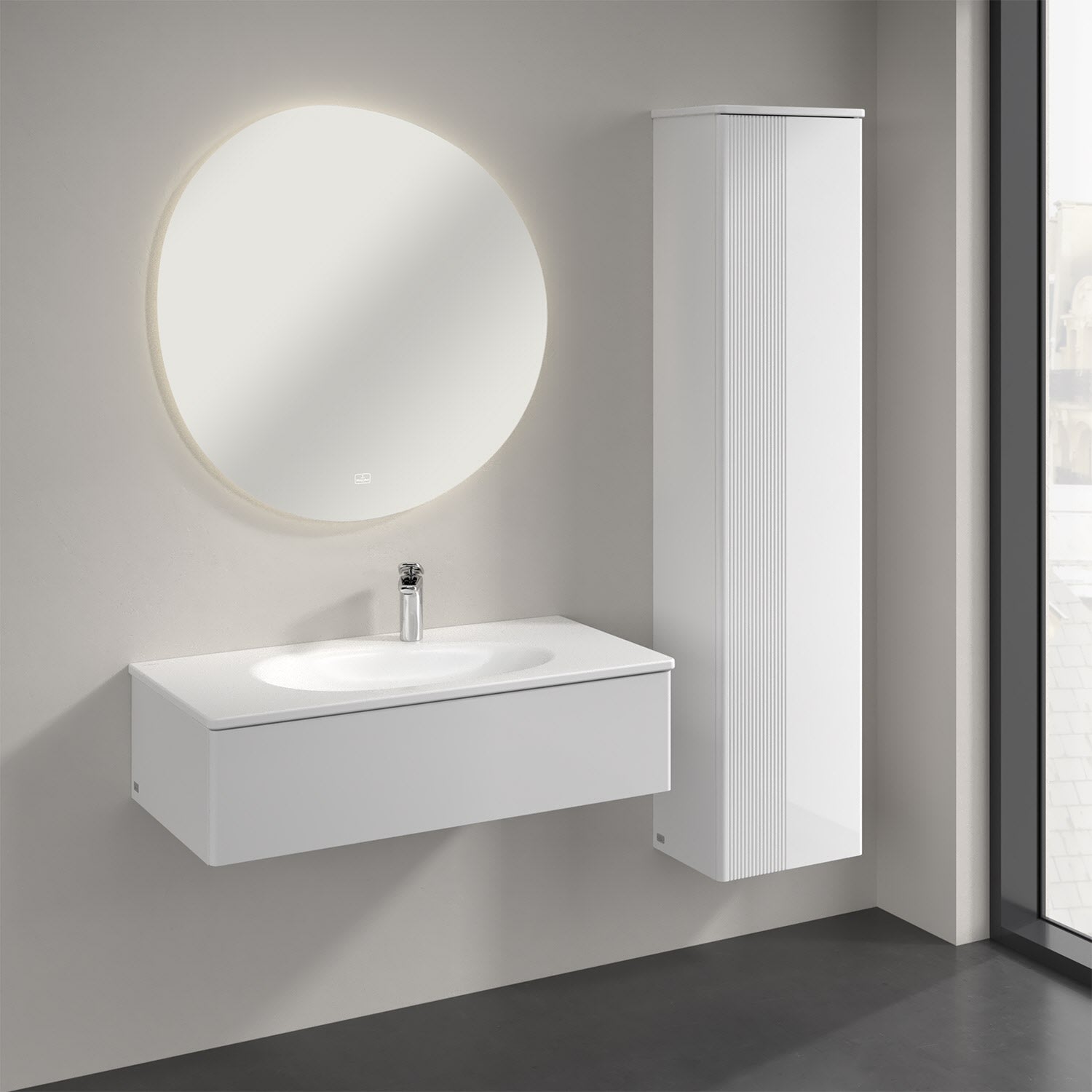Der wandhängende Antao Hochschrank von Villeroy & Boch ist eine hochwertige, moderne Lösung für Ordnung und Stauraum im Badezimmer. Hinter der sich nach rechts öffnenden Tür befindet sich auf einem fixen Fachboden und drei verstellbaren Glaseinlegeböden jede Menge Platz für Badutensilien wie Handtücher, Kosmetik, Badezusatz und vieles mehr. Die asymmetrisch strukturierte Front mit den sanft abgerundeten Kanten unterstreicht den schlichten, zeitlosen Look und macht das Öffnen zum haptischen Erlebnis. Eingebaute Dämpfer sorgen für ein angenehmes, leises Schließen der Tür. Für eine besonders leichte Pflege sorgt die mehrschichtig deckend lackierte Oberfläche. Bei der Ausführung in Massivholz wird dank des verarbeiteten Massivholzes jedes Möbel zu einem Unikat, das sich durch das lebendige Naturmaterial durch seine einzigartige Struktur und Maserung auszeichnet.