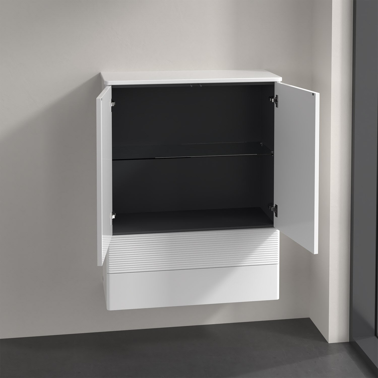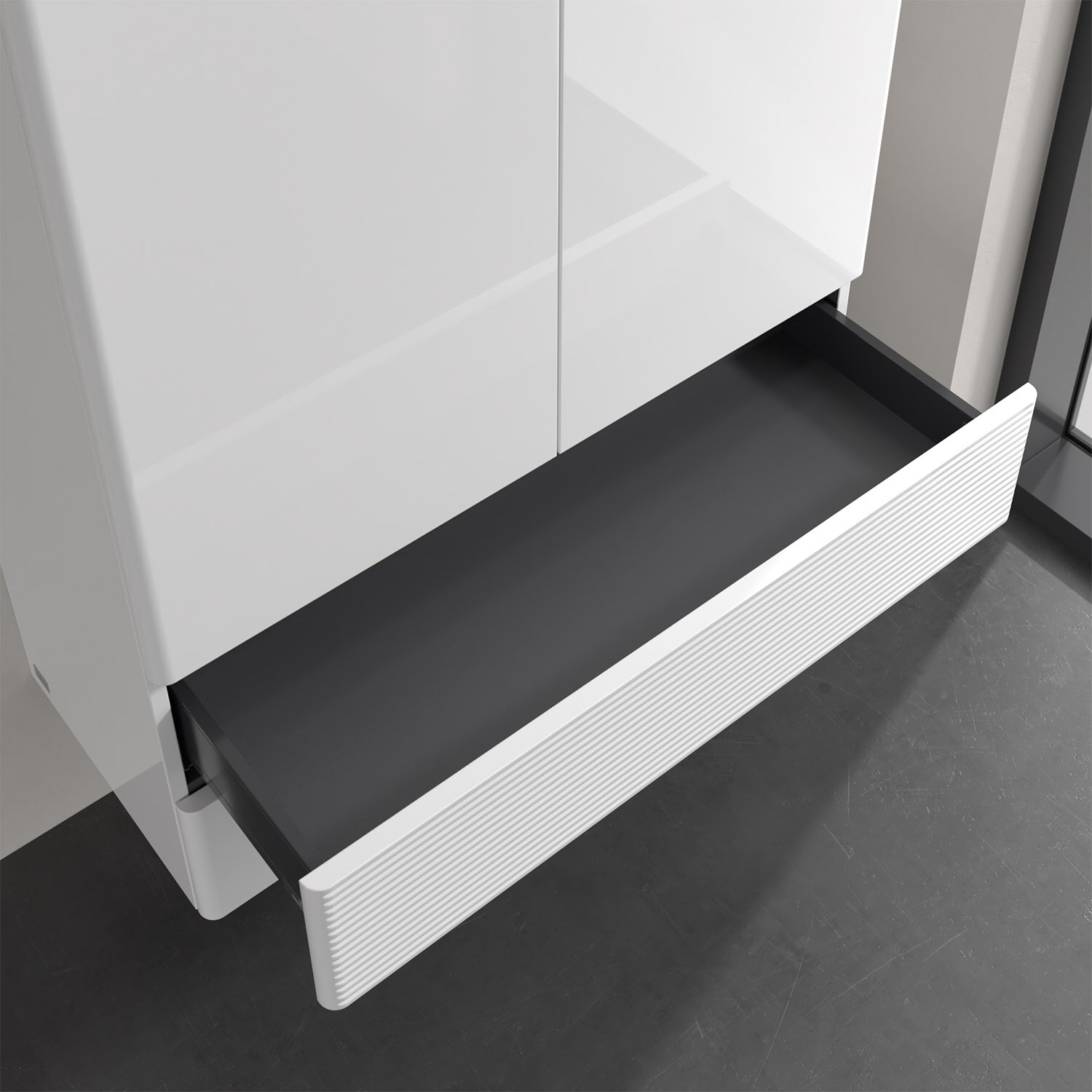 Noch nicht genügend Stauraum im Badezimmer? Dann ist das wandhängende Antao Highboard mit Flügeltür und zwei Auszügen von Villeroy & Boch die richtige Wahl. Im Inneren findet sich mit Sicherheit ausreichend Stauraum für alle Utensilien, die bei der Badroutine benötigt werden. Handtücher, Kosmetik, Toilettenpapier oder gar Reinigungsutensilien lassen sich problemlos auf dem fixen Fachboden und dem verstellbaren Glaseinlegeboden verstauen. Und sollte immer noch nicht alles verstaut sein, können die beiden vollausziehbaren Auszüge zum Einsatz kommen. Auf den Antirutschböden stehen Duschgel, Shampoo oder Haarspray garantiert sicher. Selbstverständlich verfügt das Highboard über die SoftClosing Funktion für ein sanftes und leises Schließen. Optisch verleiht der obere Auszug mit seiner strukturierten Front dem Badezimmer nochmal ein ganz besonders modernes und gemütliches Ambiente. Für eine besonders leichte Pflege sorgt die mehrschichtig deckend lackierte Oberfläche. Bei der Ausführung in Massivholz wird dank des verarbeiteten Massivholzes jedes Möbel zu einem Unikat, das sich durch das lebendige Naturmaterial durch seine einzigartige Struktur und Maserung auszeichnet.