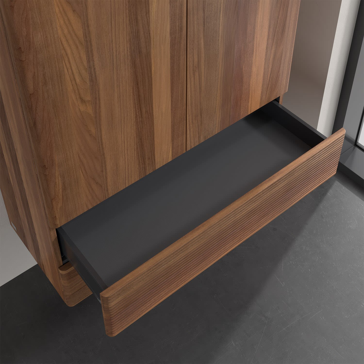 Noch nicht genügend Stauraum im Badezimmer? Dann ist das wandhängende Antao Highboard mit Flügeltür und zwei Auszügen von Villeroy & Boch die richtige Wahl. Im Inneren findet sich mit Sicherheit ausreichend Stauraum für alle Utensilien, die bei der Badroutine benötigt werden. Handtücher, Kosmetik, Toilettenpapier oder gar Reinigungsutensilien lassen sich problemlos auf dem fixen Fachboden und dem verstellbaren Glaseinlegeboden verstauen. Und sollte immer noch nicht alles verstaut sein, können die beiden vollausziehbaren Auszüge zum Einsatz kommen. Auf den Antirutschböden stehen Duschgel, Shampoo oder Haarspray garantiert sicher. Selbstverständlich verfügt das Highboard über die SoftClosing Funktion für ein sanftes und leises Schließen. Optisch verleiht der obere Auszug mit seiner strukturierten Front dem Badezimmer nochmal ein ganz besonders modernes und gemütliches Ambiente. Für eine besonders leichte Pflege sorgt die mehrschichtig deckend lackierte Oberfläche. Bei der Ausführung in Massivholz wird dank des verarbeiteten Massivholzes jedes Möbel zu einem Unikat, das sich durch das lebendige Naturmaterial durch seine einzigartige Struktur und Maserung auszeichnet.