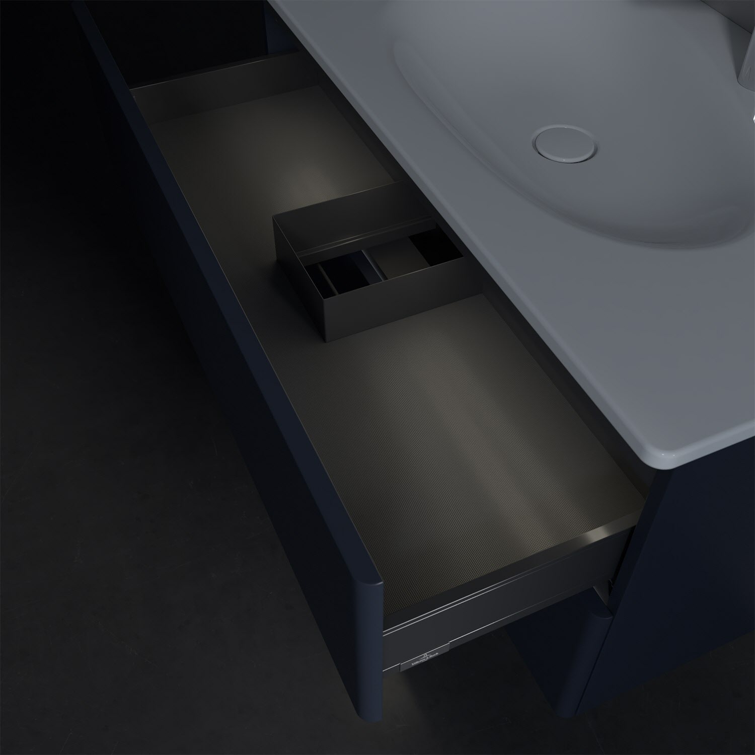 Villeroy & Boch präsentiert den wandhängenden Antao Waschtischunterschrank – hochwertiges und praktisches Badmöbel mit sanfter Formsprache und abgerundeten Kanten. Außen optisch ein Hingucker und Innen mit viel Stauraum für Badezimmerutensilien. Die grifflosen Auszüge öffnen sich durch sanften Druck auf die Front und lassen sich in ihrer vollen Tiefe ausziehen. Zusammen mit dem integrierten Antirutschboden und der angenehmen Beleuchtung in Warmweiß garantiert dies Zugang zu allen Ecken und Winkeln des Schrankes sowie den optimalen Überblick. Selbsteinzug und eingebaute Dämpfer machen auch das Schließen angenehm und kinderleicht. Clever!