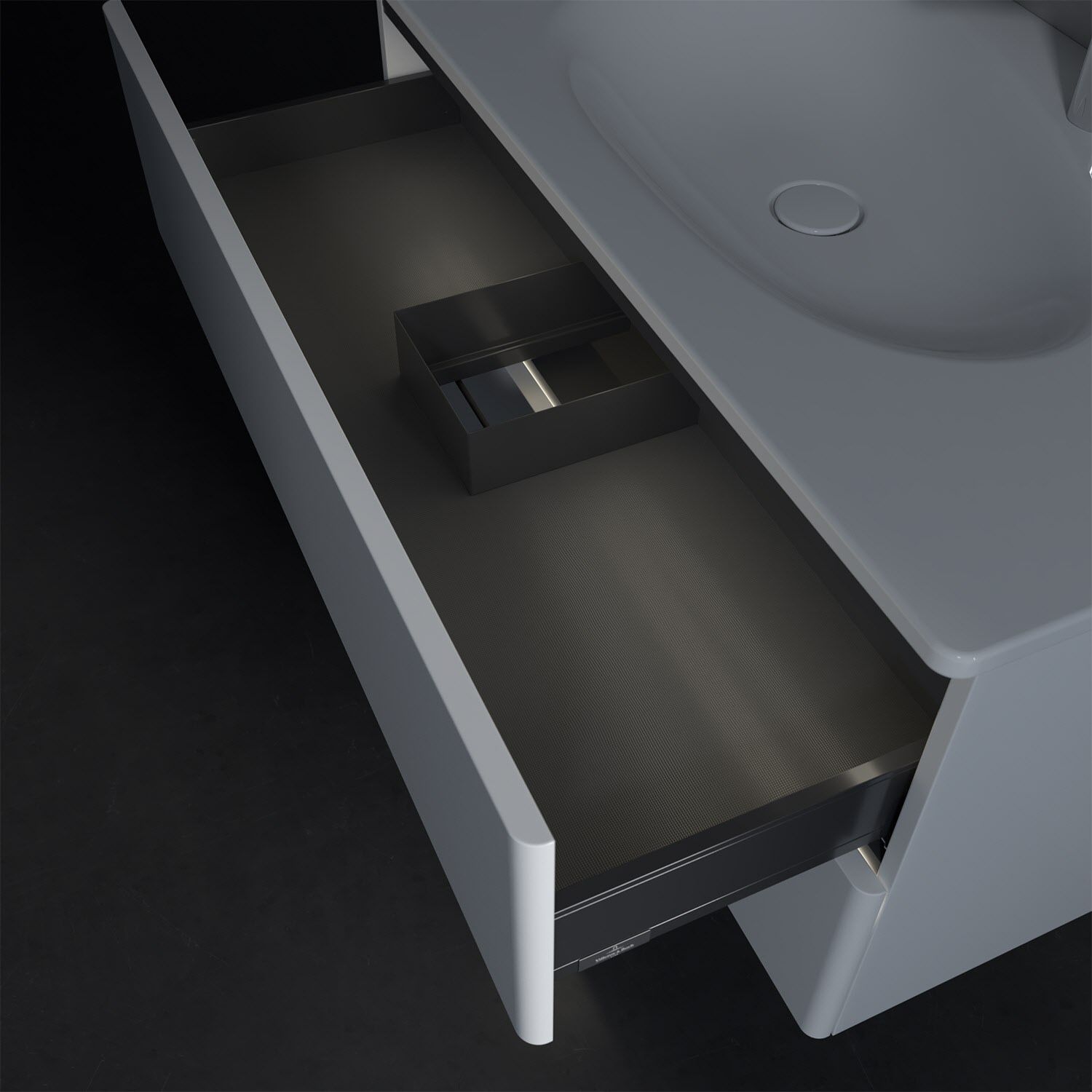 Villeroy & Boch präsentiert den wandhängenden Antao Waschtischunterschrank – hochwertiges und praktisches Badmöbel mit sanfter Formsprache und abgerundeten Kanten. Außen optisch ein Hingucker und Innen mit viel Stauraum für Badezimmerutensilien. Die grifflosen Auszüge öffnen sich durch sanften Druck auf die Front und lassen sich in ihrer vollen Tiefe ausziehen. Zusammen mit dem integrierten Antirutschboden und der angenehmen Beleuchtung in Warmweiß garantiert dies Zugang zu allen Ecken und Winkeln des Schrankes sowie den optimalen Überblick. Selbsteinzug und eingebaute Dämpfer machen auch das Schließen angenehm und kinderleicht. Clever!