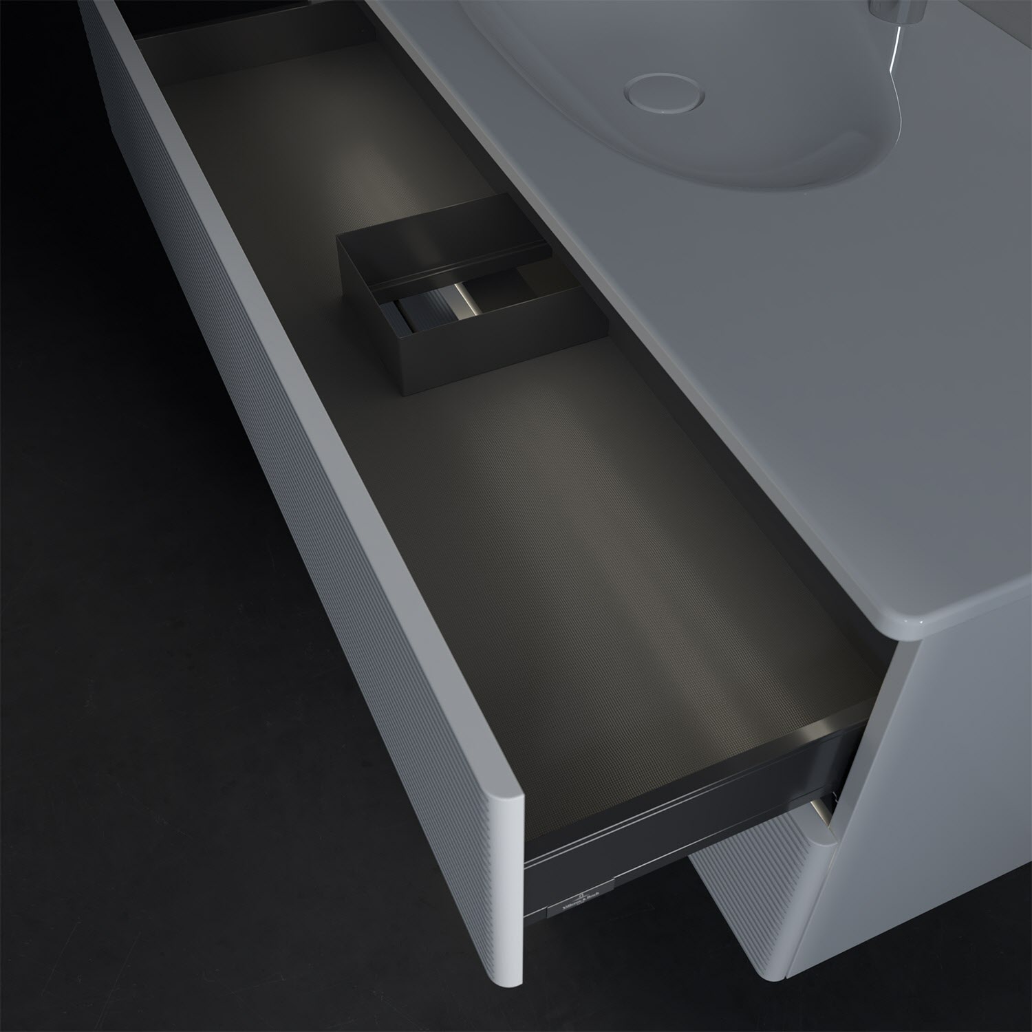 Gemütliches Ambiente im Badezimmer – das geht mit dem wandhängenden Antao Waschtischunterschrank von Villeroy & Boch. Optisch überzeugt das hochwertige Badmöbel mit sanfter Formsprache durch abgerundete Kanten. Zusätzlich schmückt dieses Modell eine strukturierte Front. Mit seiner geräumigen Größe punktet der Unterschrank aber auch funktional. In den beiden vollausziehbaren Auszügen können zahlreiche Badutensilien verstaut werden, die direkt griffbereit sein sollen. Dank integriertem Antirutschboden bleibt die Ordnung dauerhaft bestehen. Bequem öffnen lassen sich die beiden Auszüge mit integrierter Beleuchtung in Warmweiß mit der Push-to-Open-Funktion. Der Selbsteinzug sorgt anschließend für ein sanftes und leises Schließen. Mit dem passenden Schrankwaschtisch kombiniert ist das Badmöbel einfach unschlagbar. Für eine besonders leichte Pflege sorgt die mehrschichtig deckend lackierte Oberfläche. Bei der Ausführung in Massivholz wird dank des verarbeiteten Massivholzes jedes Möbel zu einem Unikat, das sich durch das lebendige Naturmaterial durch seine einzigartige Struktur und Maserung auszeichnet.