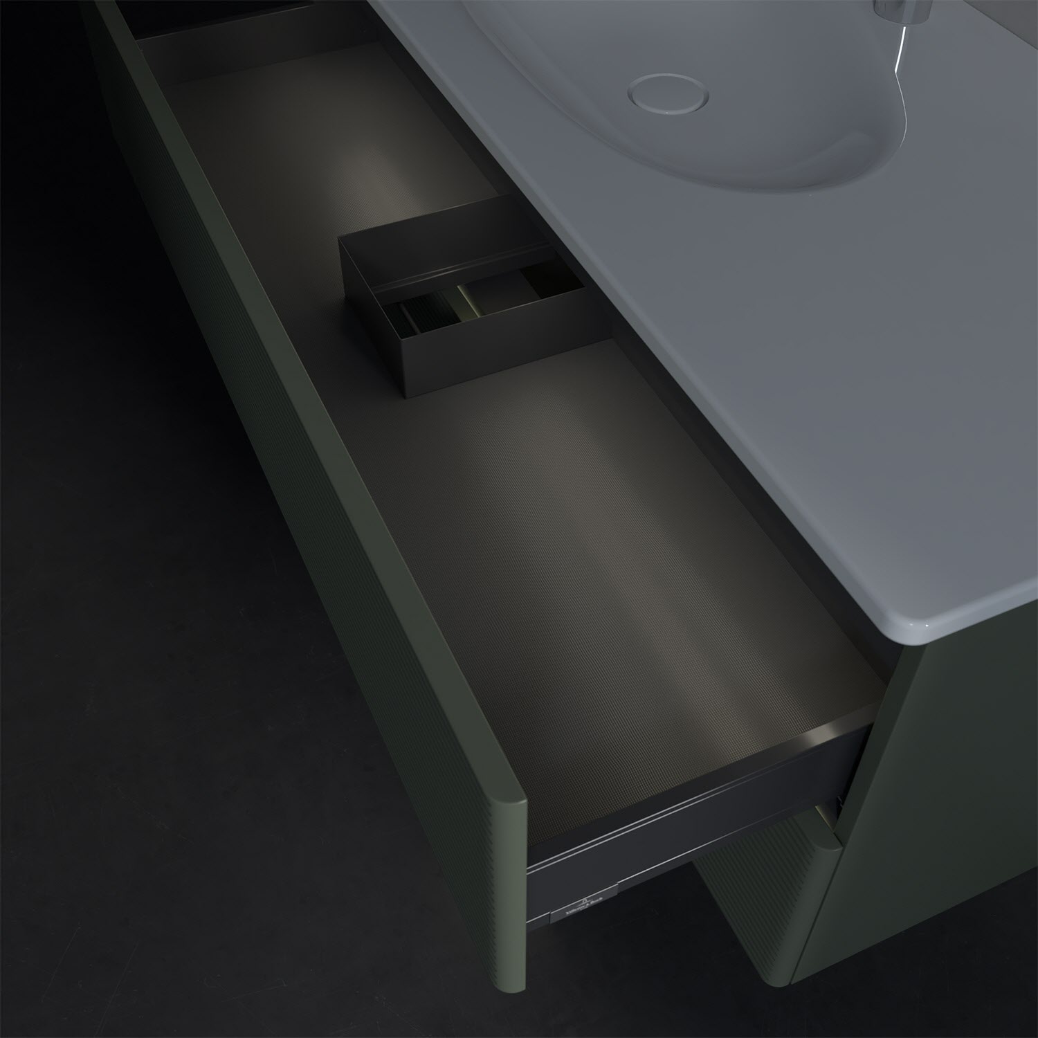 Gemütliches Ambiente im Badezimmer – das geht mit dem wandhängenden Antao Waschtischunterschrank von Villeroy & Boch. Optisch überzeugt das hochwertige Badmöbel mit sanfter Formsprache durch abgerundete Kanten. Zusätzlich schmückt dieses Modell eine strukturierte Front. Mit seiner geräumigen Größe punktet der Unterschrank aber auch funktional. In den beiden vollausziehbaren Auszügen können zahlreiche Badutensilien verstaut werden, die direkt griffbereit sein sollen. Dank integriertem Antirutschboden bleibt die Ordnung dauerhaft bestehen. Bequem öffnen lassen sich die beiden Auszüge mit integrierter Beleuchtung in Warmweiß mit der Push-to-Open-Funktion. Der Selbsteinzug sorgt anschließend für ein sanftes und leises Schließen. Mit dem passenden Schrankwaschtisch kombiniert ist das Badmöbel einfach unschlagbar. Für eine besonders leichte Pflege sorgt die mehrschichtig deckend lackierte Oberfläche. Bei der Ausführung in Massivholz wird dank des verarbeiteten Massivholzes jedes Möbel zu einem Unikat, das sich durch das lebendige Naturmaterial durch seine einzigartige Struktur und Maserung auszeichnet.