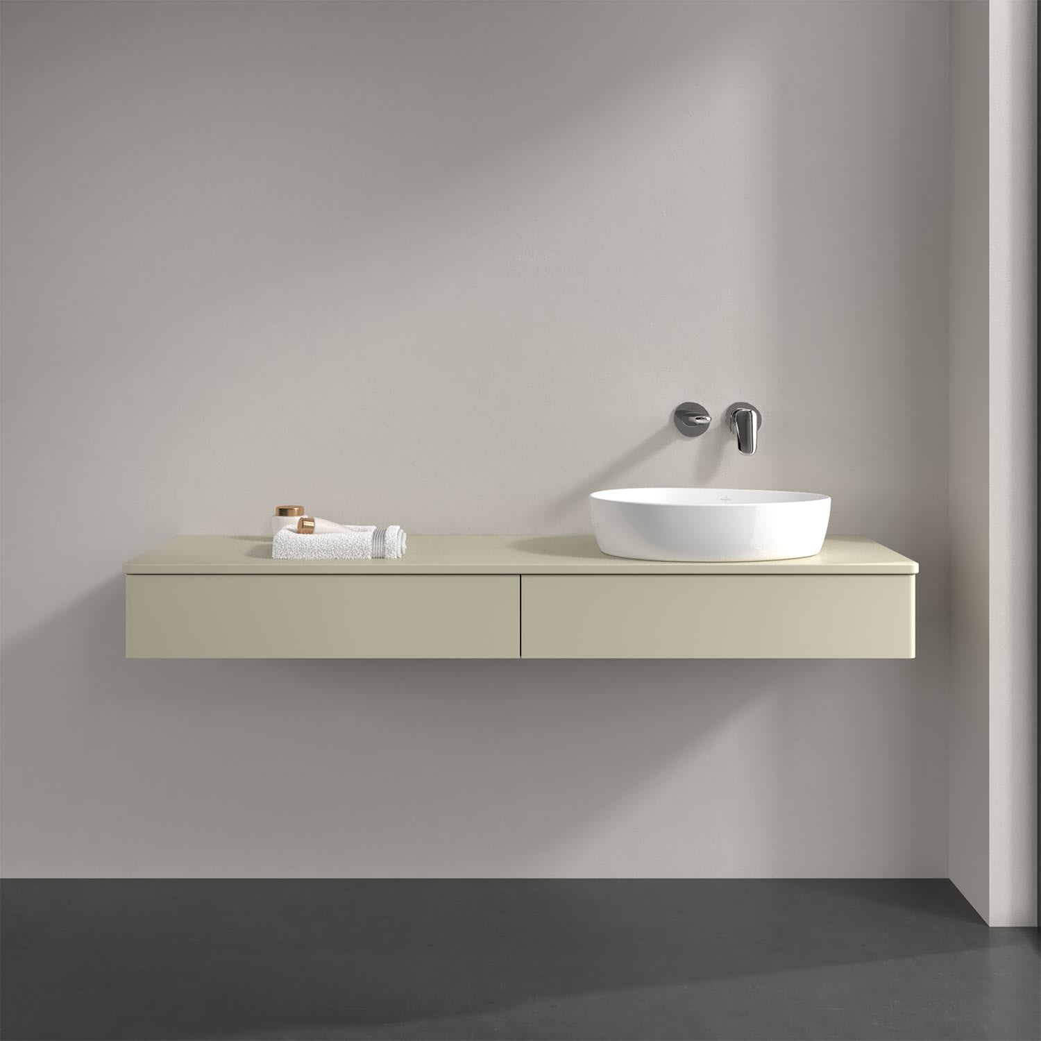 Für diesen Waschbeckenunterschrank stehen Ihnen Aufsatzwaschtische aus verschiedenen Serien zur Verfügung (siehe "Passliste" unter Downloads). Ein ausgewähltes Beispiel finden Sie im Zubehör. Den Waschtisch bitte separat mitbestellen.