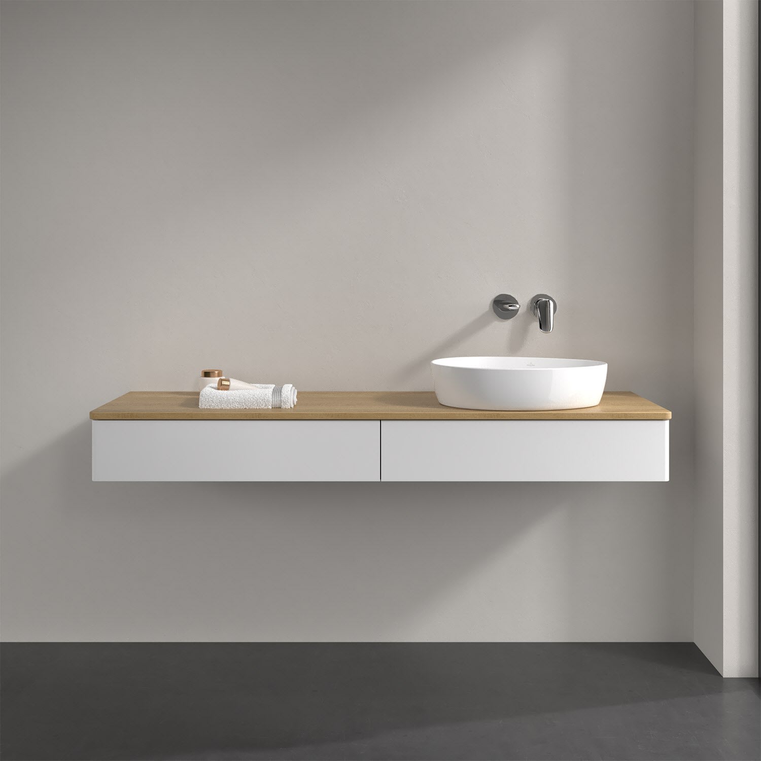 Villeroy & Boch Antao Waschbeckenunterschrank, 160 x 19 cm, 2 Auszüge, Front ohne Struktur, ohne Hahnloch, für Waschtisch rechts
