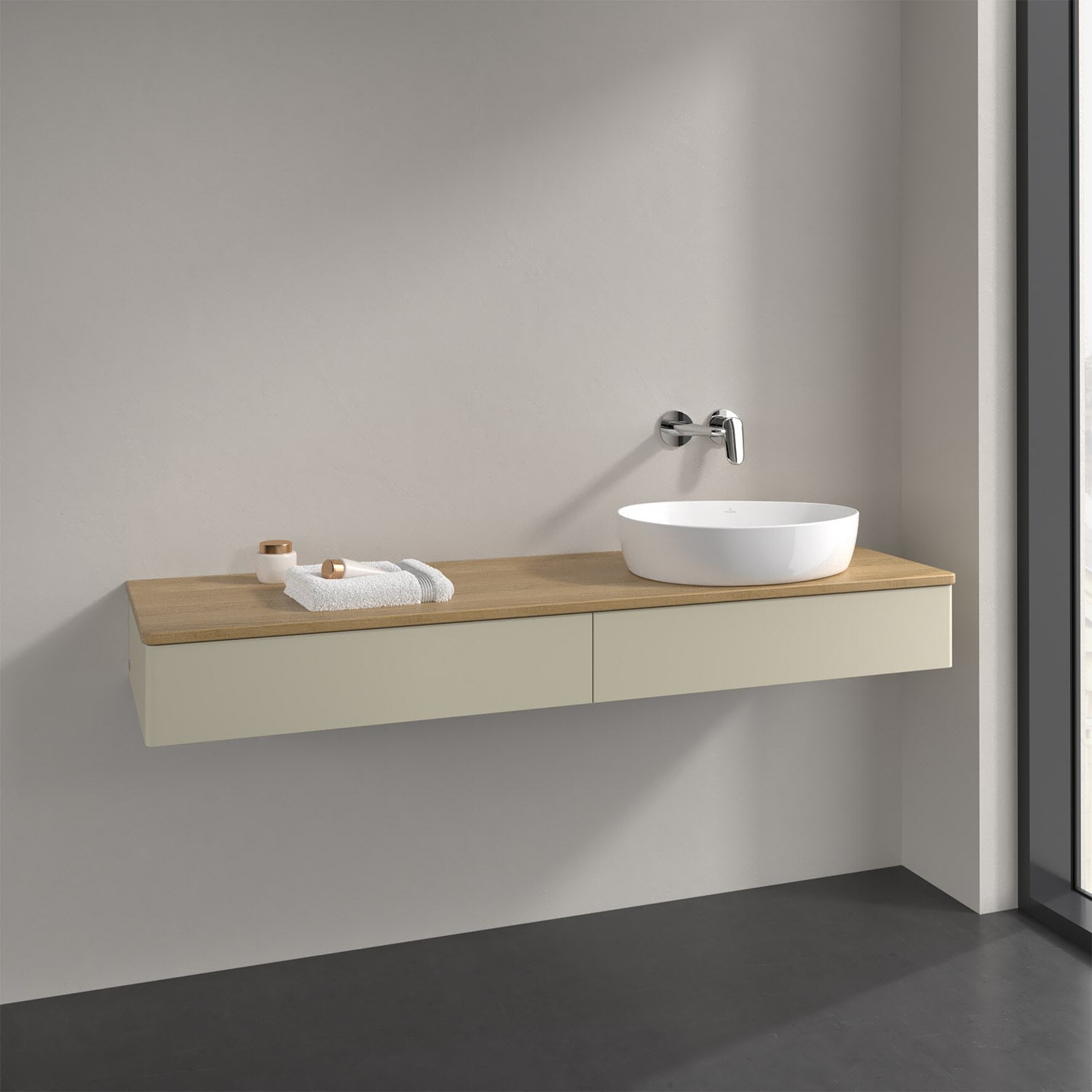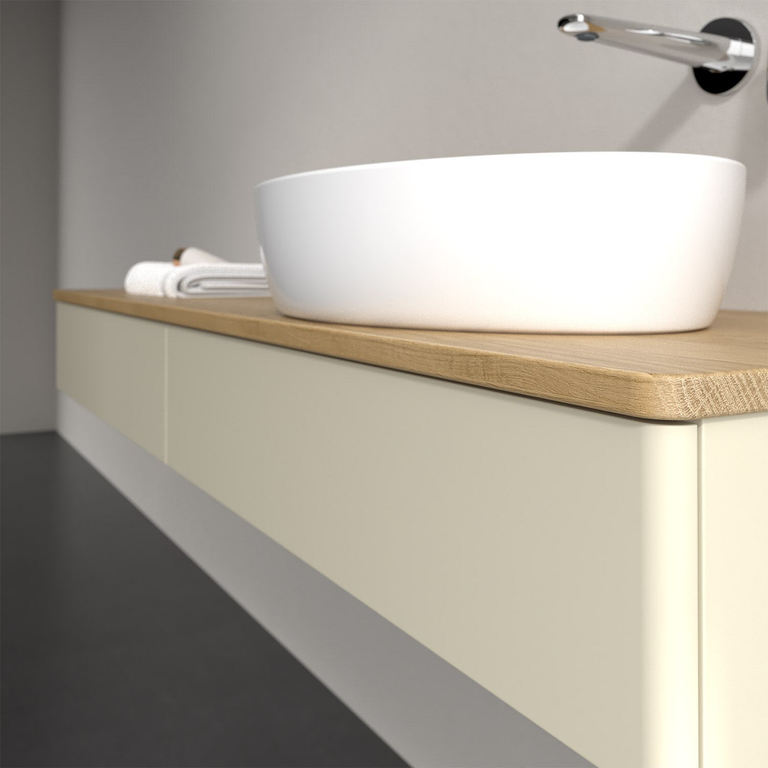 Für diesen Waschbeckenunterschrank stehen Ihnen Aufsatzwaschtische aus verschiedenen Serien zur Verfügung (siehe "Passliste" unter Downloads). Ein ausgewähltes Beispiel finden Sie im Zubehör. Den Waschtisch bitte separat mitbestellen.