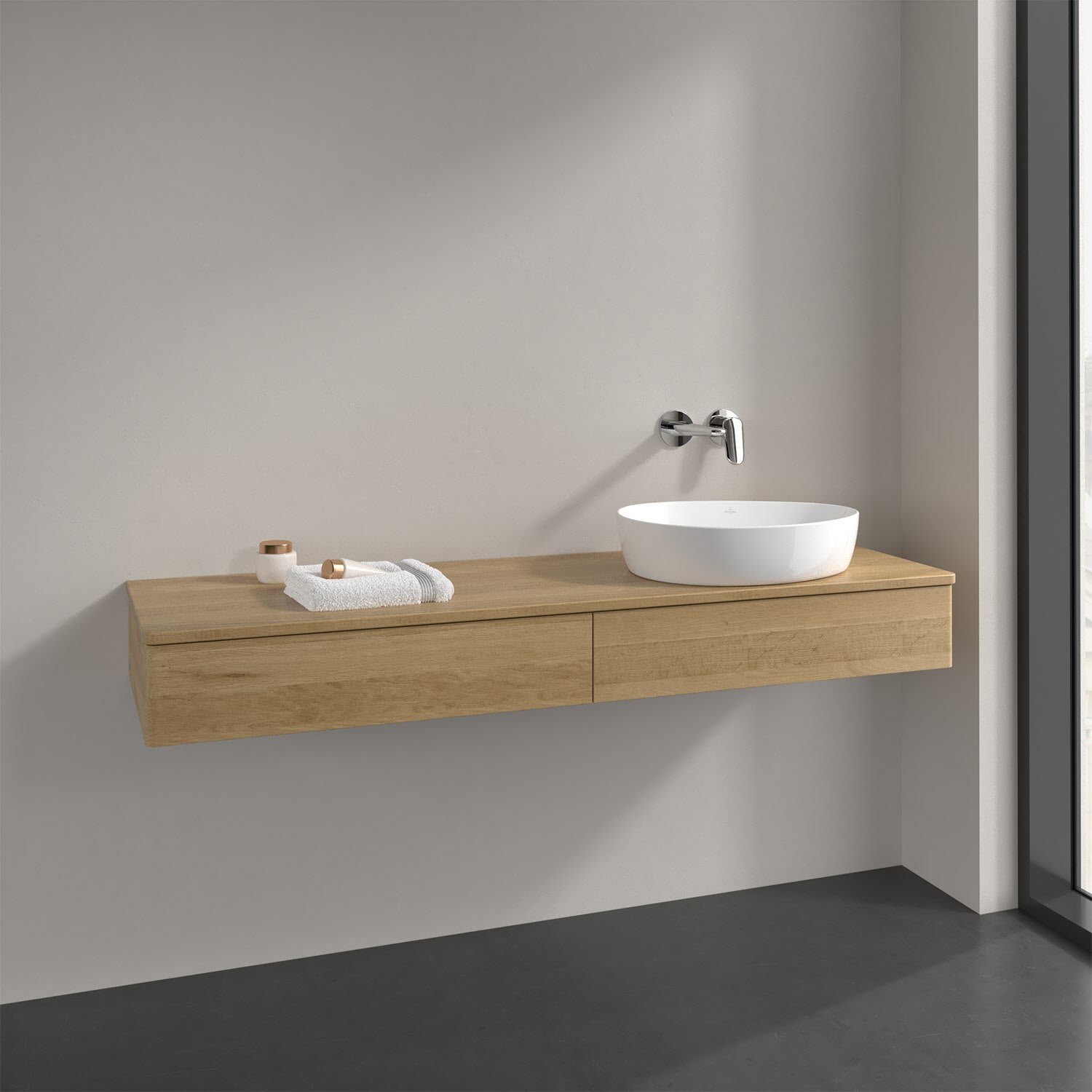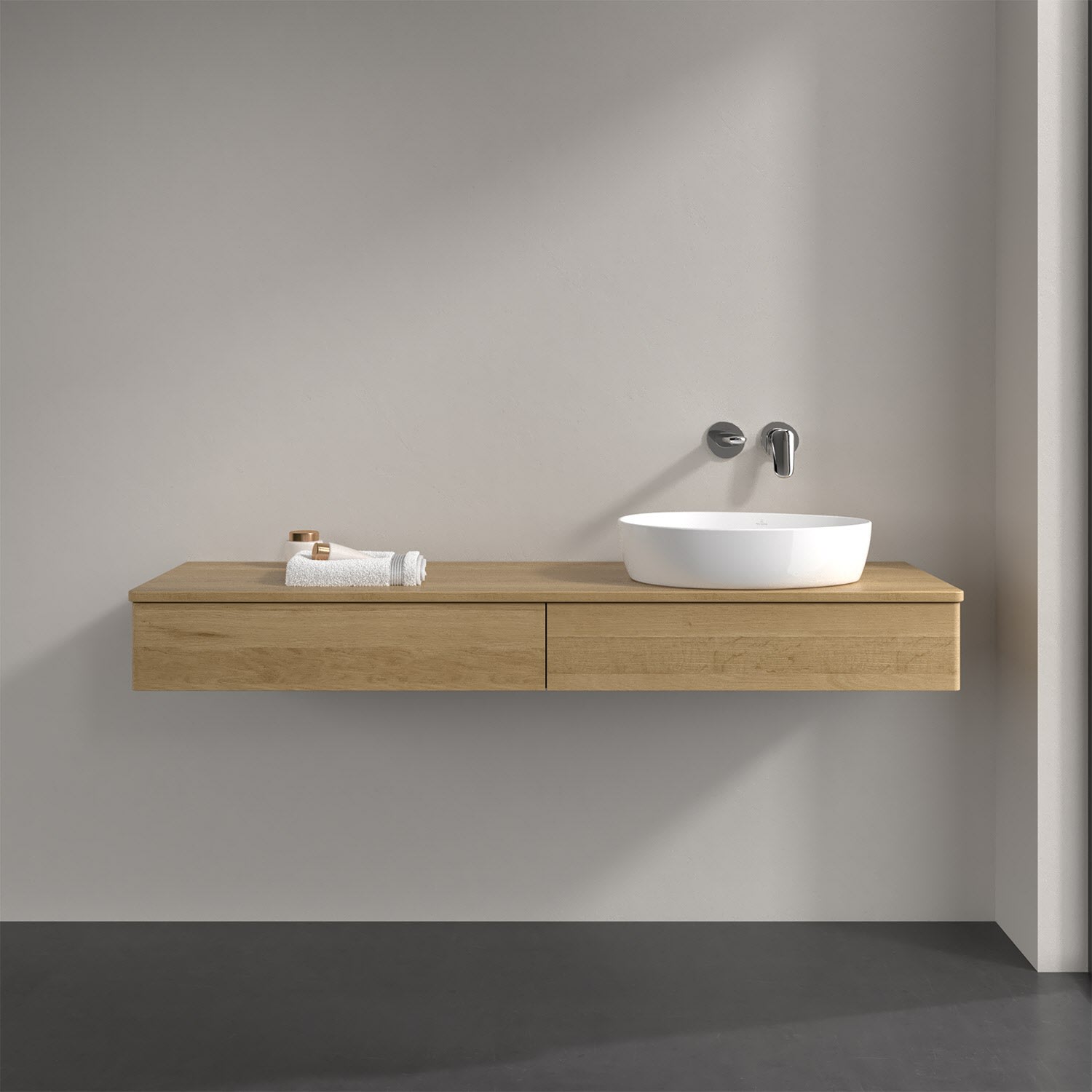 Villeroy & Boch Antao Waschbeckenunterschrank, 160 x 19 cm, 2 Auszüge, Front ohne Struktur, ohne Hahnloch, für Waschtisch rechts