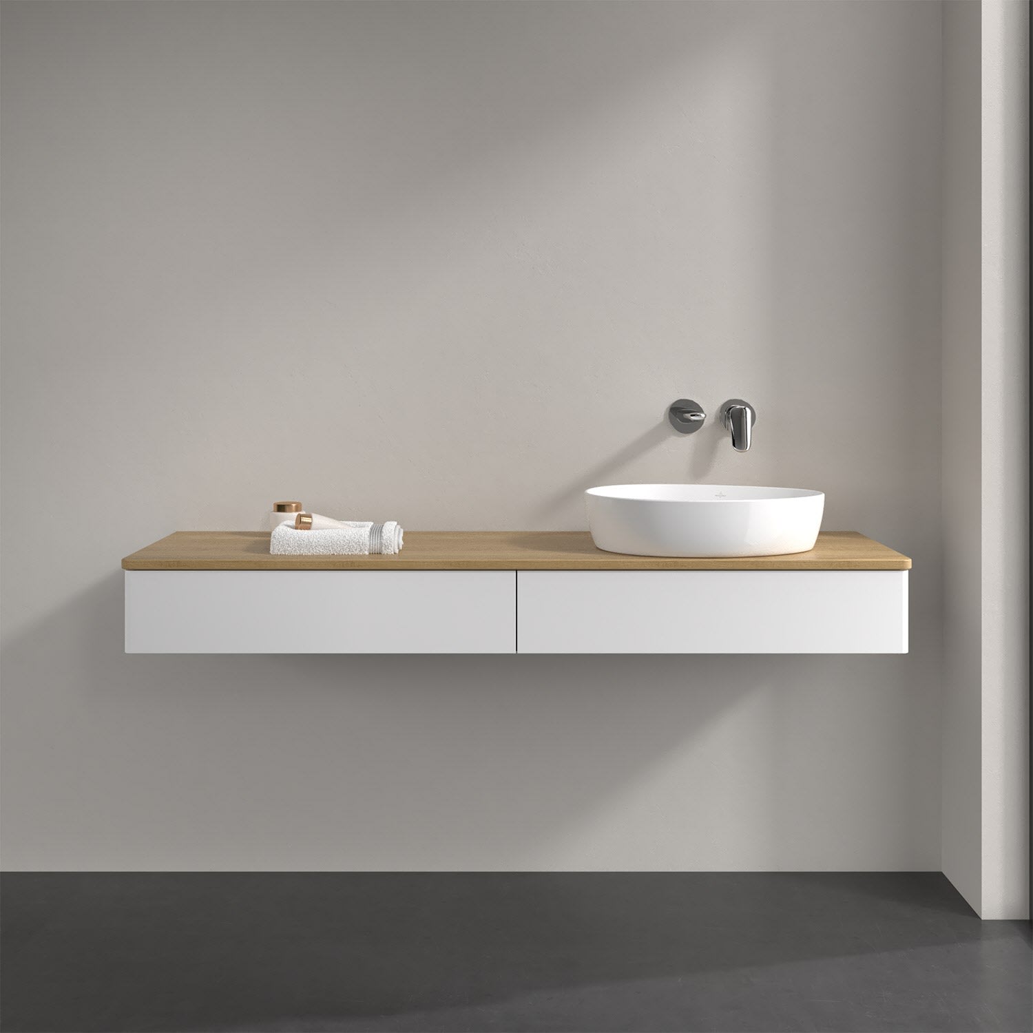 Villeroy & Boch Antao Waschbeckenunterschrank, 160 x 19 cm, 2 Auszüge, Front ohne Struktur, ohne Hahnloch, für Waschtisch rechts