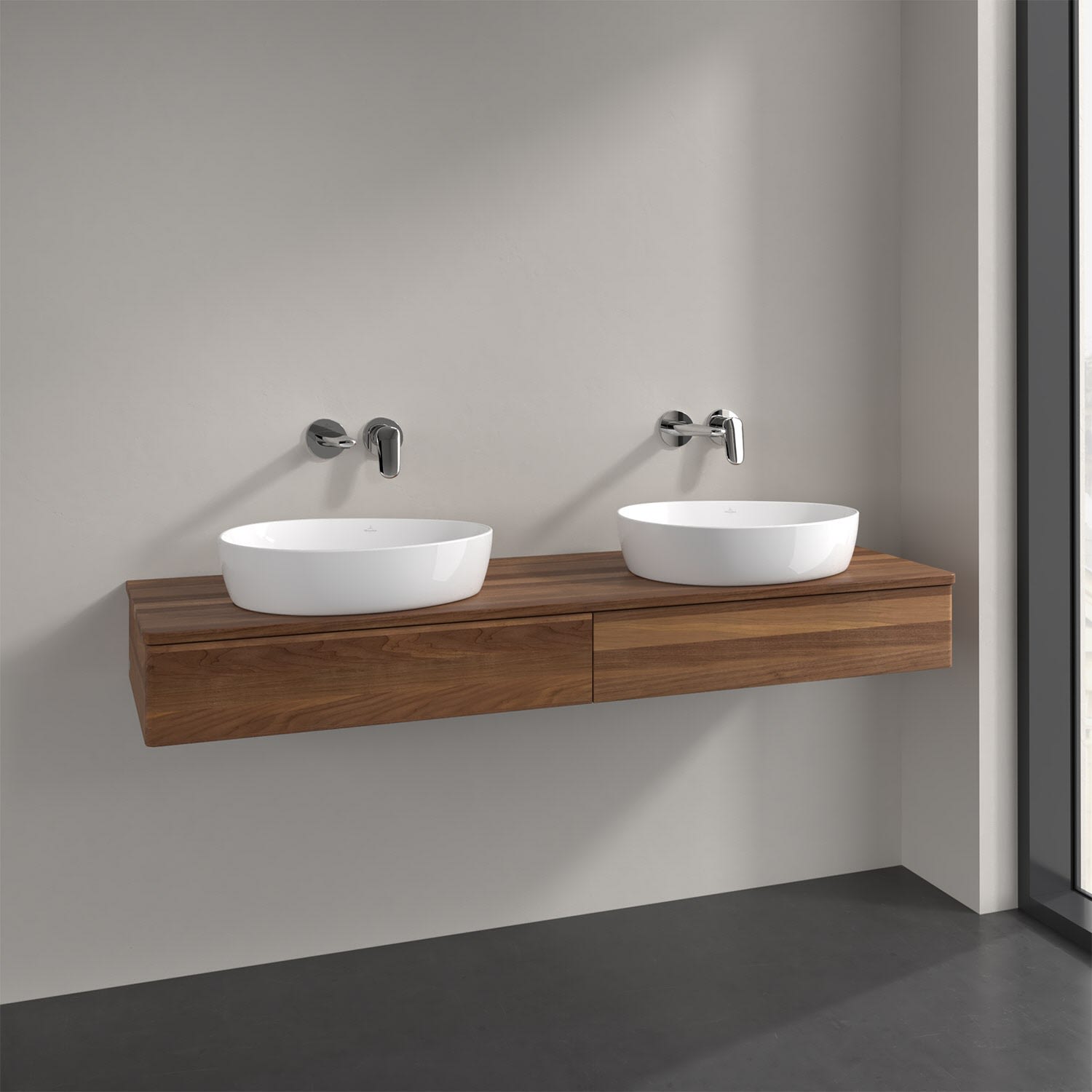 Der wandhängende Antao Waschtischunterschrank von Villeroy & Boch bietet nicht nur jede Menge Stauraum – er ist dank seines naturinspirierten Designs mit seinen abgerundeten Kanten auch noch besonders stilvoll und schafft eine gemütliche Atmosphäre im Badezimmer. Kombiniert mit zwei passenden Aufsatzwaschtischen also die ideale Wahl. Der geräumige Auszug bietet viel Platz, um alles Notwendige zu verstauen und Ordnung zu halten. Öffnen lässt er sich durch leichten Druck auf die grifflose Front. Dank Vollauszug hat man immer alles im Blick und der Antirutschboden verhindert ein Umfallen oder Verrutschen der Gegenstände. Einfach clever! Für eine besonders leichte Pflege sorgt die mehrschichtig deckend lackierte Oberfläche. Bei der Ausführung in Massivholz wird dank des verarbeiteten Massivholzes jedes Möbel zu einem Unikat, das sich durch das lebendige Naturmaterial durch seine einzigartige Struktur und Maserung auszeichnet.