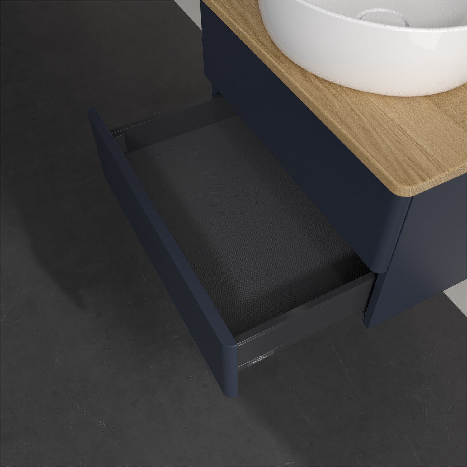 Wenig Platz im Badezimmer und dennoch soll es gemütlich und ordentlich sein? Dann ist der wandhängende Antao Waschtischunterschrank mit seinen sanft abgerundeten Kanten die ideale Lösung. Das geräumige Möbel bietet ausreichend Stauraum für alle nötigen Badutensilien. Zum Öffnen genügt dank der Push-to-Open Funktion ein leichter Druck auf die beiden grifflosen Auszüge, die sich dann in ihrer vollen Tiefe öffnen. Das garantiert den benötigen Überblick! Praktisch ist auch der integrierte Antirutschboden und die SoftClosing Funktion, die ein Umfallen oder Verrutschen der verstauten Produkte verhindern. Villeroy & Boch hat alles durchdacht! Für eine besonders leichte Pflege sorgt die mehrschichtig deckend lackierte Oberfläche. Bei der Ausführung in Massivholz wird dank des verarbeiteten Massivholzes jedes Möbel zu einem Unikat, das sich durch das lebendige Naturmaterial durch seine einzigartige Struktur und Maserung auszeichnet.