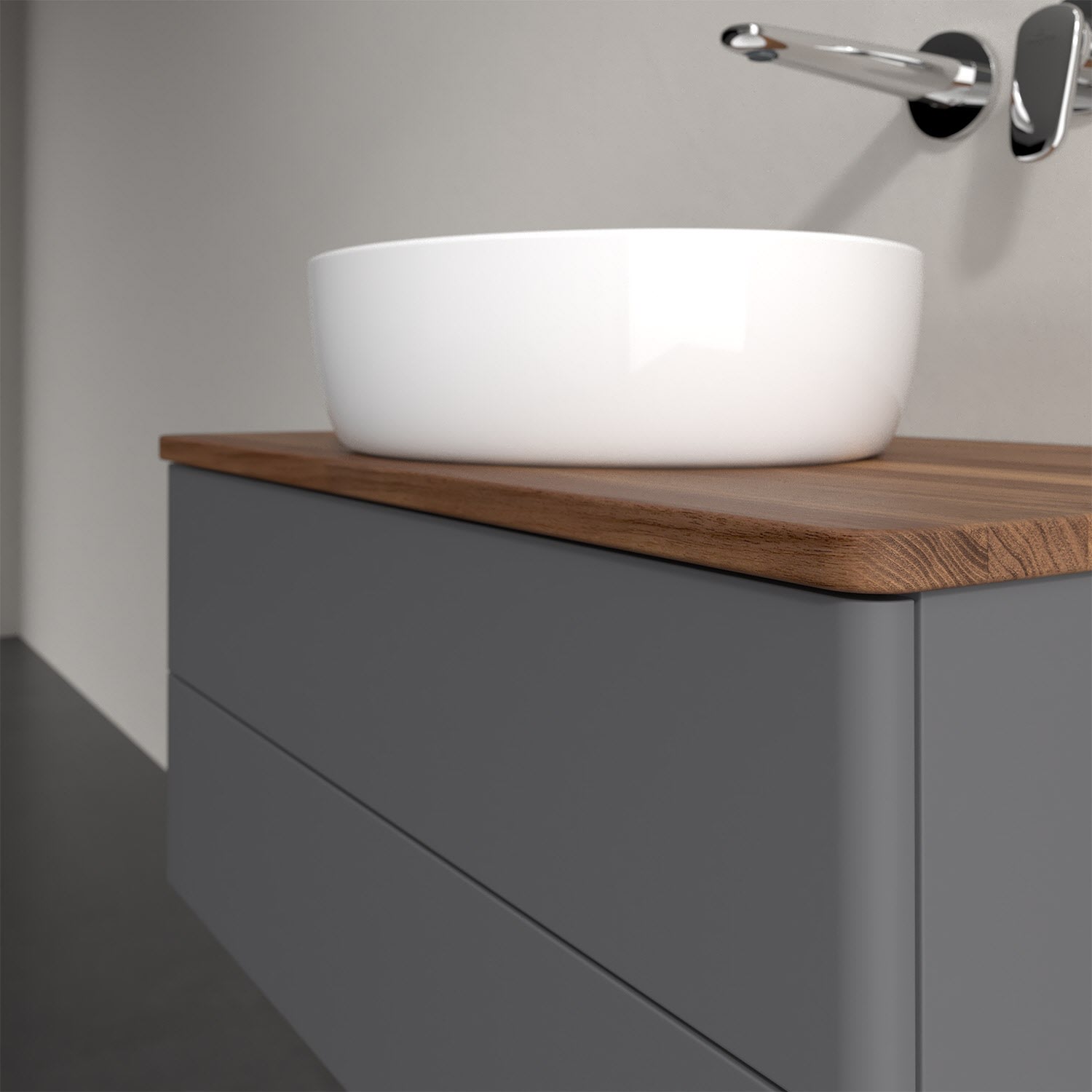 Mit dem wandhängenden Waschtischunterschrank der Kollektion Antao wird ein natürliches und gemütliches Flair am Waschplatz geschaffen. Dafür sorgen die sanfte Formsprache und die abgerundete Kanten des hochwertigen Badmöbels. Die wichtigsten Badutensilien für die tägliche Routine können seitlich des Waschtischs auf die Waschtischplatte gestellt werden. Ansonsten bieten zwei Auszüge inklusive Antirutschboden ausreichend Platz für weitere Produkte, die garantiert bleiben, wo sie hingehören. Der Unterschrank verfügt zudem über einen Vollauszug und Selbsteinzug mit SoftClosing Funktion, damit er bequem und mühelos geöffnet und geschlossen werden kann. Gewohnte Qualität von Villeroy & Boch! Für eine besonders leichte Pflege sorgt die mehrschichtig deckend lackierte Oberfläche. Bei der Ausführung in Massivholz wird dank des verarbeiteten Massivholzes jedes Möbel zu einem Unikat, das sich durch das lebendige Naturmaterial durch seine einzigartige Struktur und Maserung auszeichnet.