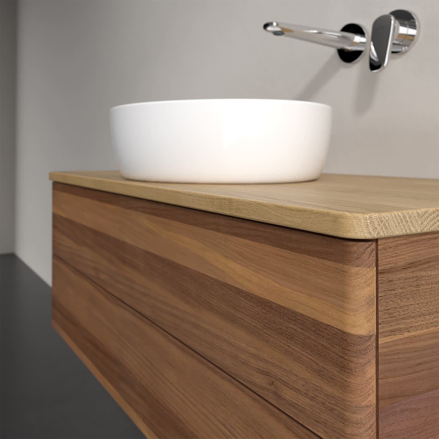 Mit dem wandhängenden Antao Waschtischunterschrank entscheidet man sich für eine hochwertige und praktische Stauraumlösung, die viel Freude bereitet. Die Funktionen sind besonders gut durchdacht: Im Inneren der beiden vollausziehbaren Auszüge können Handtücher, Kosmetik oder andere Pflegeprodukte dank des Antirutschbodens bequem aufbewahrt werden. Geöffnet wird das Möbel durch leichten Druck auf die grifflose Front. Natürlich verfügen die Auszüge über eingebaute Dämpfer, die sie anschließend wieder sanft und leise schließen lassen. Auch auf der Waschtischplatte finden die wichtigsten Utensilien seitlich des Waschtischs genügend Platz. Optisch sorgt der Unterschrank von Villeroy & Boch mit seinen abgerundeten Kanten für ein modernes, gemütliches Ambiente. Für eine besonders leichte Pflege sorgt die mehrschichtig deckend lackierte Oberfläche. Bei der Ausführung in Massivholz wird dank des verarbeiteten Massivholzes jedes Möbel zu einem Unikat, das sich durch das lebendige Naturmaterial durch seine einzigartige Struktur und Maserung auszeichnet.