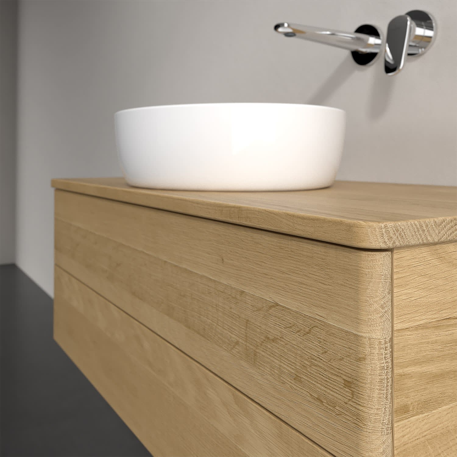Mit dem wandhängenden Antao Waschtischunterschrank entscheidet man sich für eine hochwertige und praktische Stauraumlösung, die viel Freude bereitet. Die Funktionen sind besonders gut durchdacht: Im Inneren der beiden vollausziehbaren Auszüge können Handtücher, Kosmetik oder andere Pflegeprodukte dank des Antirutschbodens bequem aufbewahrt werden. Geöffnet wird das Möbel durch leichten Druck auf die grifflose Front. Natürlich verfügen die Auszüge über eingebaute Dämpfer, die sie anschließend wieder sanft und leise schließen lassen. Auch auf der Waschtischplatte finden die wichtigsten Utensilien seitlich des Waschtischs genügend Platz. Optisch sorgt der Unterschrank von Villeroy & Boch mit seinen abgerundeten Kanten für ein modernes, gemütliches Ambiente. Für eine besonders leichte Pflege sorgt die mehrschichtig deckend lackierte Oberfläche. Bei der Ausführung in Massivholz wird dank des verarbeiteten Massivholzes jedes Möbel zu einem Unikat, das sich durch das lebendige Naturmaterial durch seine einzigartige Struktur und Maserung auszeichnet.