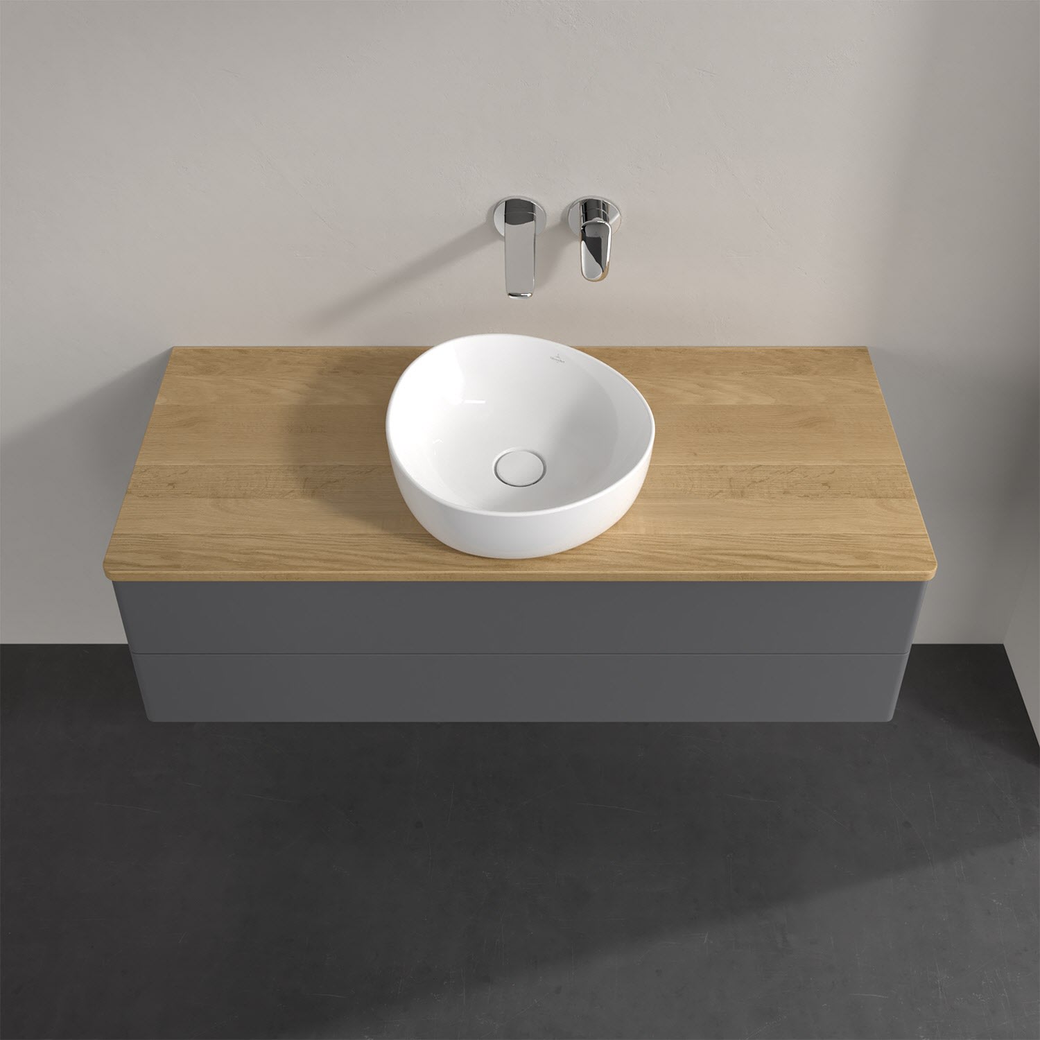 Der wandhängende Antao Waschtischunterschrank von Villeroy & Boch bietet nicht nur jede Menge Stauraum – er ist dank seines naturinspirierten Designs mit seinen abgerundeten Kanten auch noch besonders stilvoll und schafft eine gemütliche Atmosphäre im Badezimmer. Auf der Waschtischplatte bietet sich rechts und links neben dem Waschtisch viel Platz für Zahnbürstenbecher oder Seifenspender. Zwei geräumige Auszüge bieten viel Platz, um alles Notwendige zu verstauen und Ordnung zu halten. Öffnen lassen sie sich durch leichten Druck auf die grifflose Front. Dank Vollauszug hat man immer alles im Blick und der Antirutschboden verhindert ein Umfallen oder Verrutschen der Gegenstände. Einfach clever! Für eine besonders leichte Pflege sorgt die mehrschichtig deckend lackierte Oberfläche. Bei der Ausführung in Massivholz wird dank des verarbeiteten Massivholzes jedes Möbel zu einem Unikat, das sich durch das lebendige Naturmaterial durch seine einzigartige Struktur und Maserung auszeichnet.