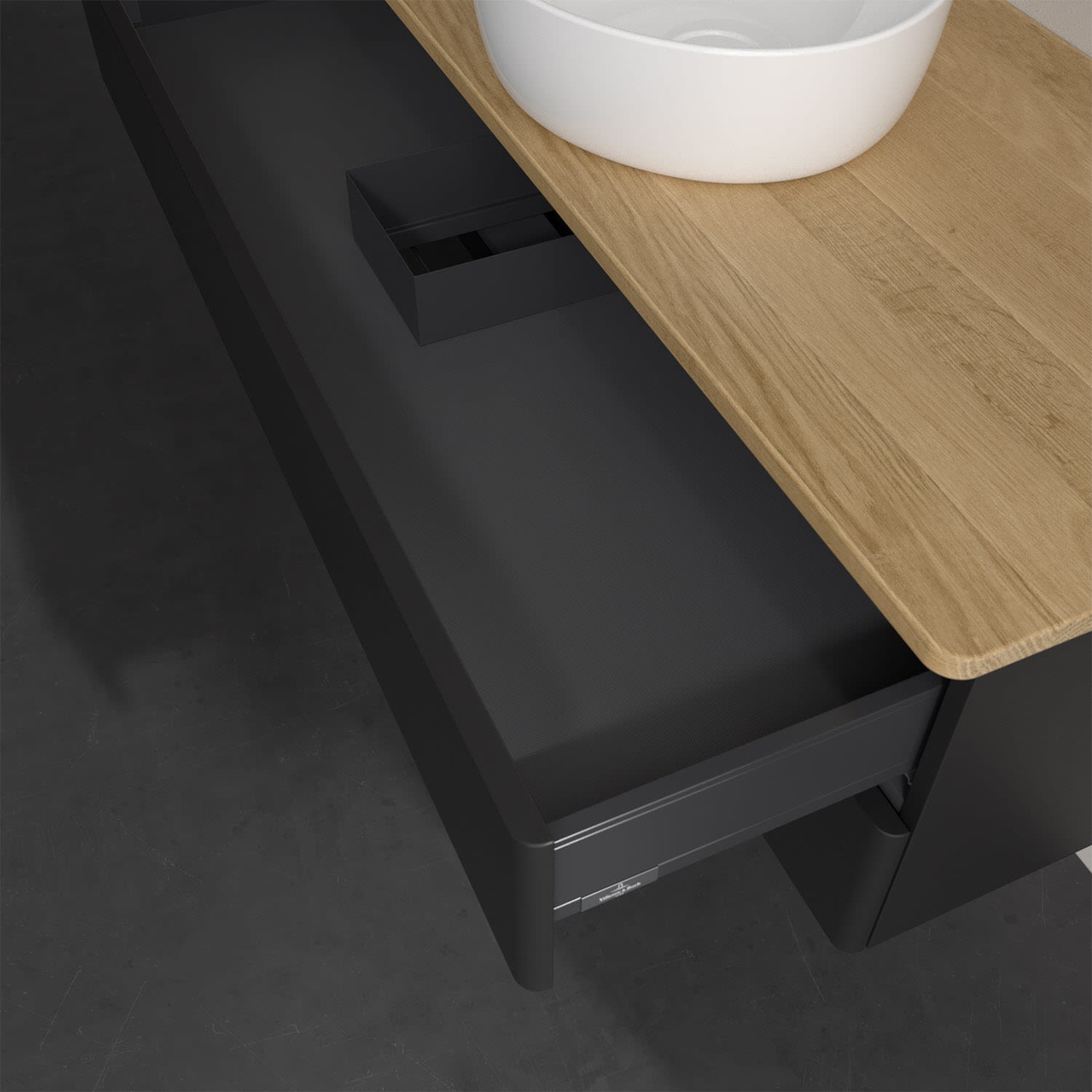Der wandhängende Antao Waschtischunterschrank von Villeroy & Boch bietet nicht nur jede Menge Stauraum – er ist dank seines naturinspirierten Designs mit seinen abgerundeten Kanten auch noch besonders stilvoll und schafft eine gemütliche Atmosphäre im Badezimmer. Auf der Waschtischplatte bietet sich rechts und links neben dem Waschtisch viel Platz für Zahnbürstenbecher oder Seifenspender. Zwei geräumige Auszüge bieten viel Platz, um alles Notwendige zu verstauen und Ordnung zu halten. Öffnen lassen sie sich durch leichten Druck auf die grifflose Front. Dank Vollauszug hat man immer alles im Blick und der Antirutschboden verhindert ein Umfallen oder Verrutschen der Gegenstände. Einfach clever! Für eine besonders leichte Pflege sorgt die mehrschichtig deckend lackierte Oberfläche. Bei der Ausführung in Massivholz wird dank des verarbeiteten Massivholzes jedes Möbel zu einem Unikat, das sich durch das lebendige Naturmaterial durch seine einzigartige Struktur und Maserung auszeichnet.
