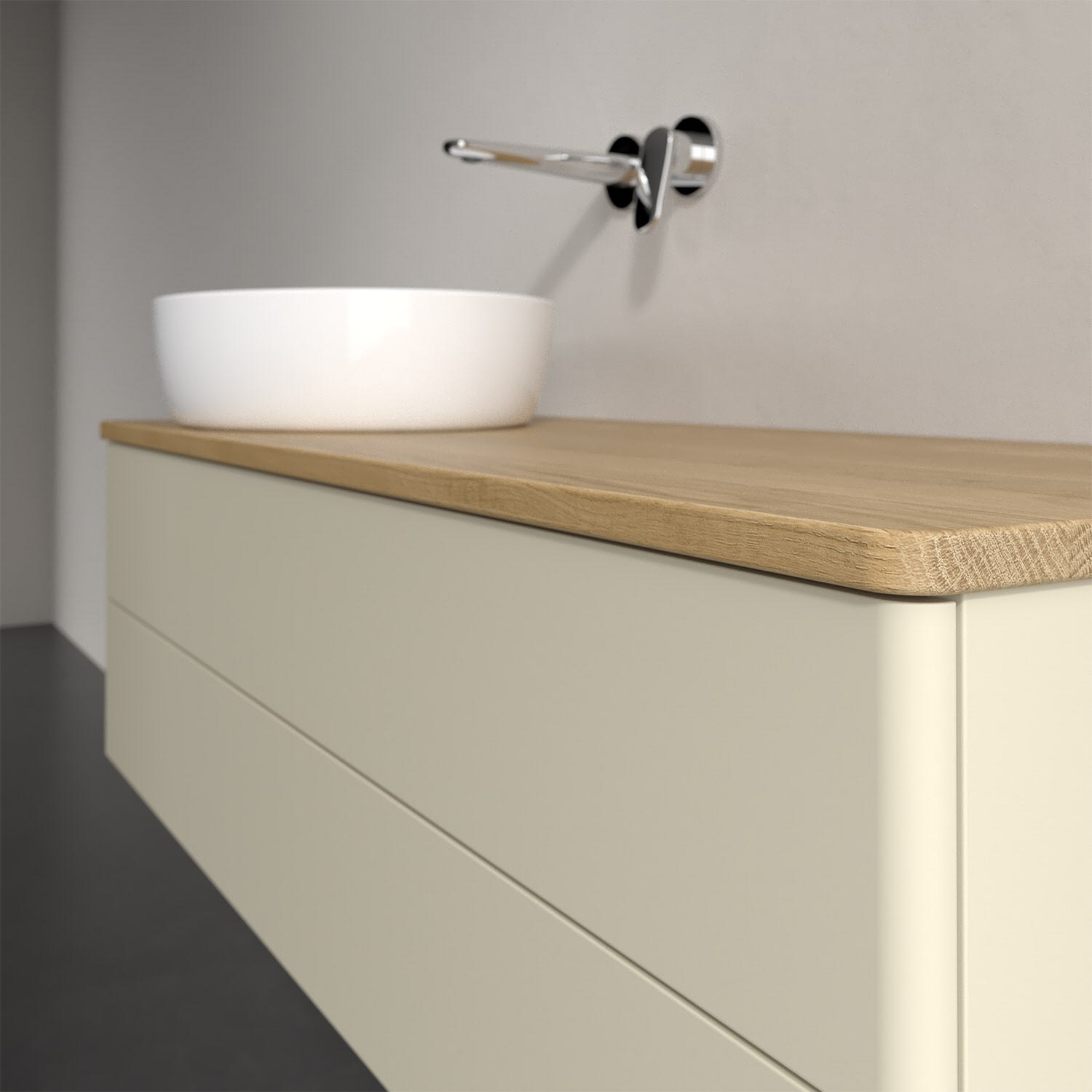 Für diesen Waschbeckenunterschrank stehen Ihnen Aufsatzwaschtische aus verschiedenen Serien zur Verfügung (siehe "Passliste" unter Downloads). Ein ausgewähltes Beispiel finden Sie im Zubehör. Den Waschtisch bitte separat mitbestellen.