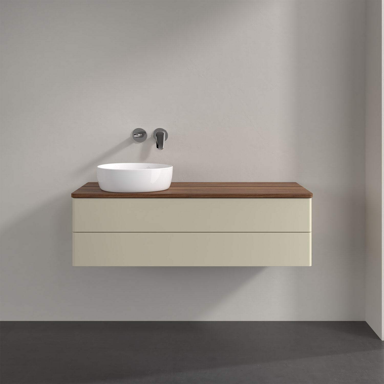 Für diesen Waschbeckenunterschrank stehen Ihnen Aufsatzwaschtische aus verschiedenen Serien zur Verfügung (siehe "Passliste" unter Downloads). Ein ausgewähltes Beispiel finden Sie im Zubehör. Den Waschtisch bitte separat mitbestellen.
