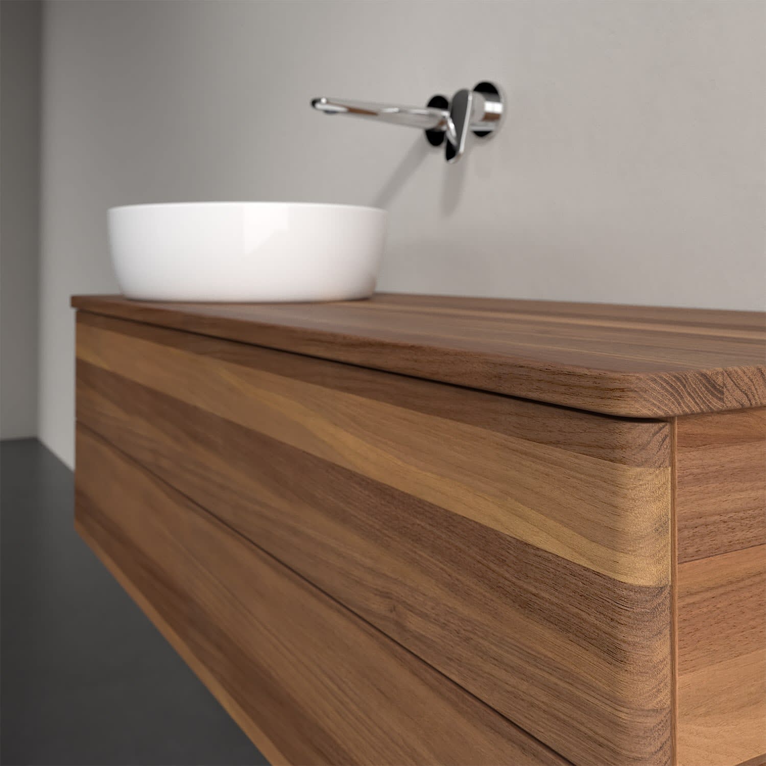 Der wandhängende Antao Waschtischunterschrank von Villeroy & Boch bietet nicht nur jede Menge Stauraum – er ist dank seines naturinspirierten Designs mit seinen abgerundeten Kanten auch noch besonders stilvoll und schafft eine gemütliche Atmosphäre im Badezimmer. Auf der Waschtischplatte bietet sich seitlich des Waschtischs viel Platz für Zahnbürstenbecher oder Seifenspender. Zwei geräumige Auszüge bieten viel Platz, um alles Notwendige zu verstauen und Ordnung zu halten. Öffnen lassen sie sich durch leichten Druck auf die grifflose Front. Dank Vollauszug hat man immer alles im Blick und der Antirutschboden verhindert ein Umfallen oder Verrutschen der Gegenstände. Einfach clever! Für eine besonders leichte Pflege sorgt die mehrschichtig deckend lackierte Oberfläche. Bei der Ausführung in Massivholz wird dank des verarbeiteten Massivholzes jedes Möbel zu einem Unikat, das sich durch das lebendige Naturmaterial durch seine einzigartige Struktur und Maserung auszeichnet.