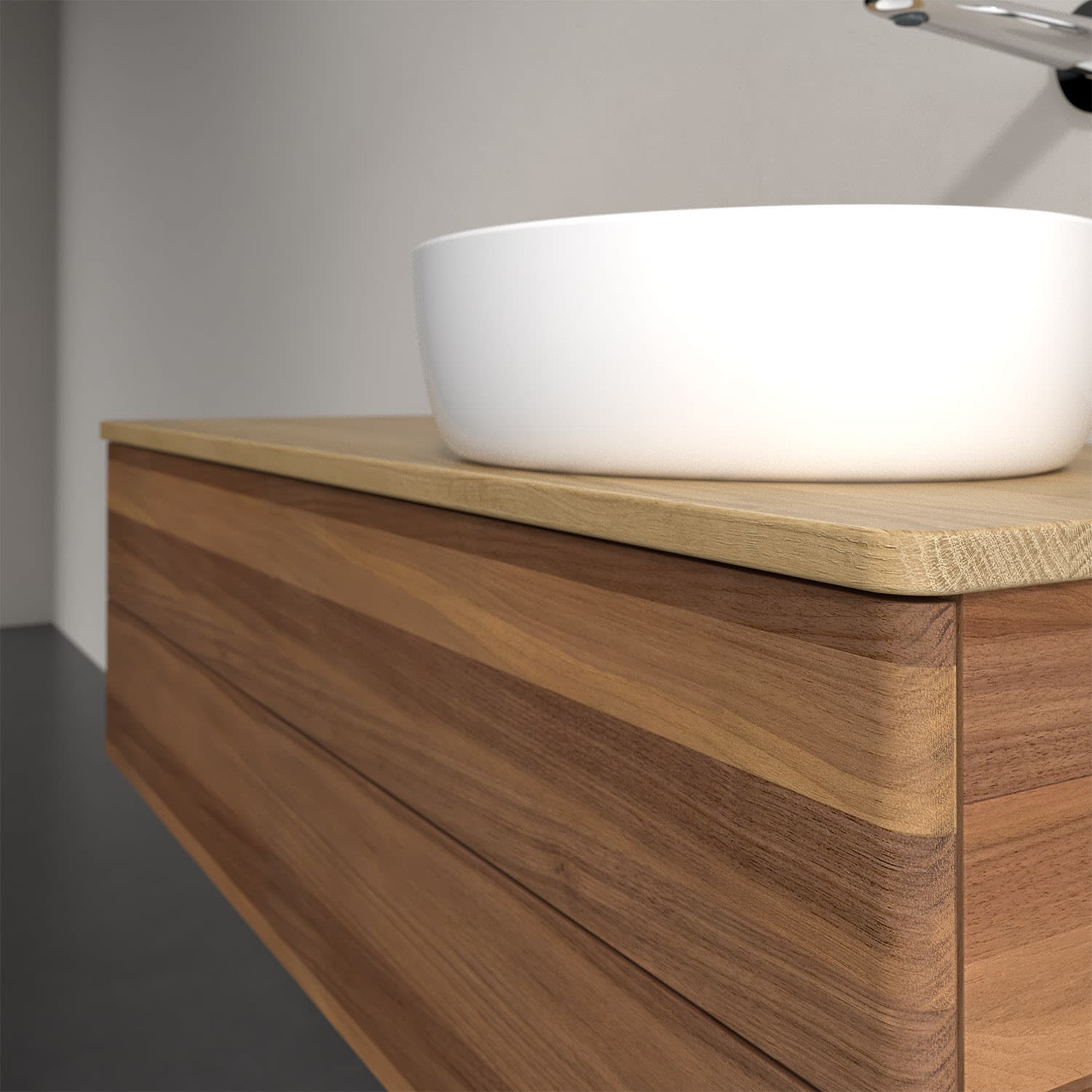 Der wandhängende Antao Waschtischunterschrank von Villeroy & Boch bietet nicht nur jede Menge Stauraum – er ist dank seines naturinspirierten Designs mit seinen abgerundeten Kanten auch noch besonders stilvoll und schafft eine gemütliche Atmosphäre im Badezimmer. Auf der Waschtischplatte bietet sich seitlich des Waschtischs viel Platz für Zahnbürstenbecher oder Seifenspender. Zwei geräumige Auszüge bieten viel Platz, um alles Notwendige zu verstauen und Ordnung zu halten. Öffnen lassen sie sich durch leichten Druck auf die grifflose Front. Dank Vollauszug hat man immer alles im Blick und der Antirutschboden verhindert ein Umfallen oder Verrutschen der Gegenstände. Einfach clever! Für eine besonders leichte Pflege sorgt die mehrschichtig deckend lackierte Oberfläche. Bei der Ausführung in Massivholz wird dank des verarbeiteten Massivholzes jedes Möbel zu einem Unikat, das sich durch das lebendige Naturmaterial durch seine einzigartige Struktur und Maserung auszeichnet.