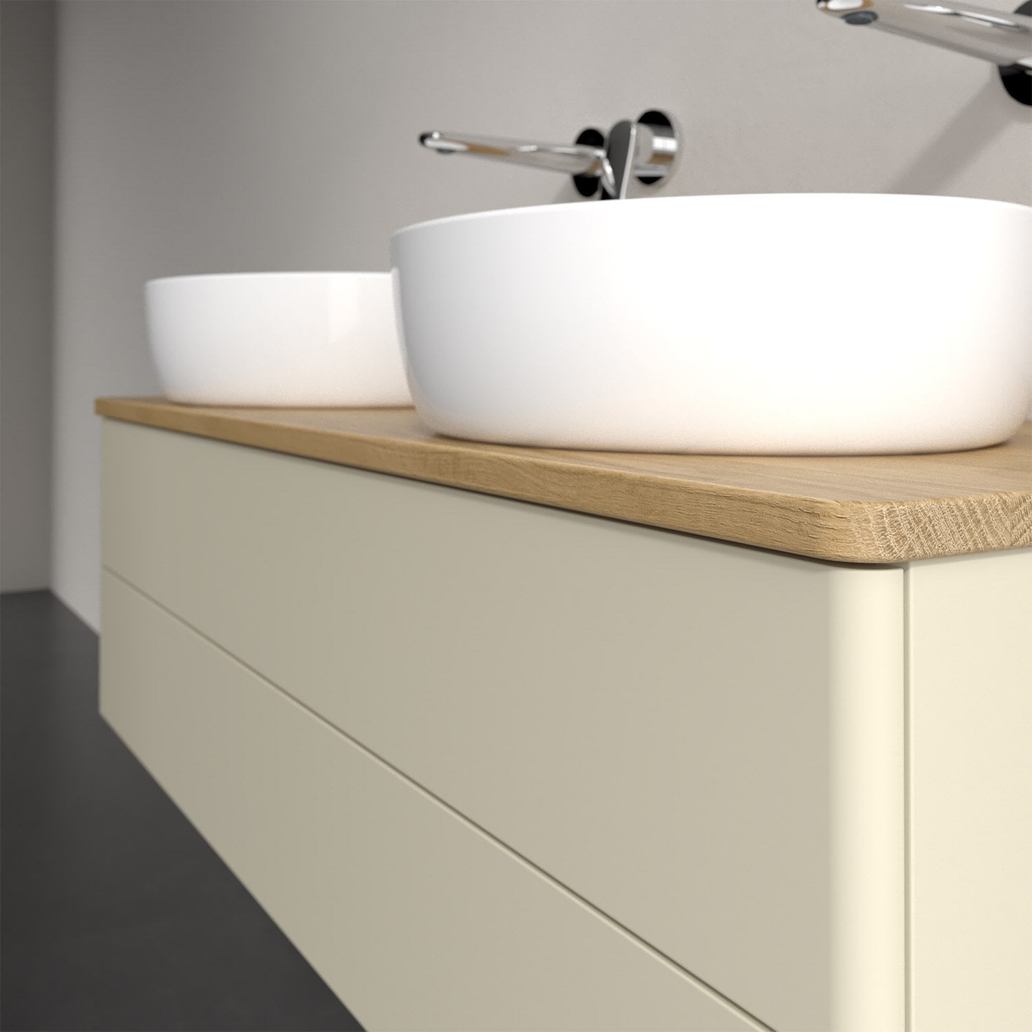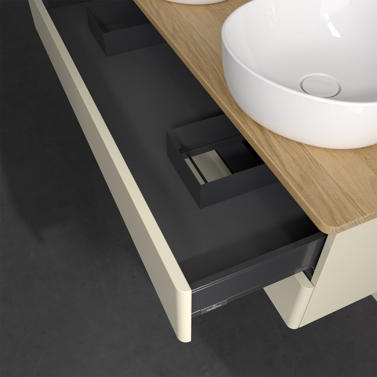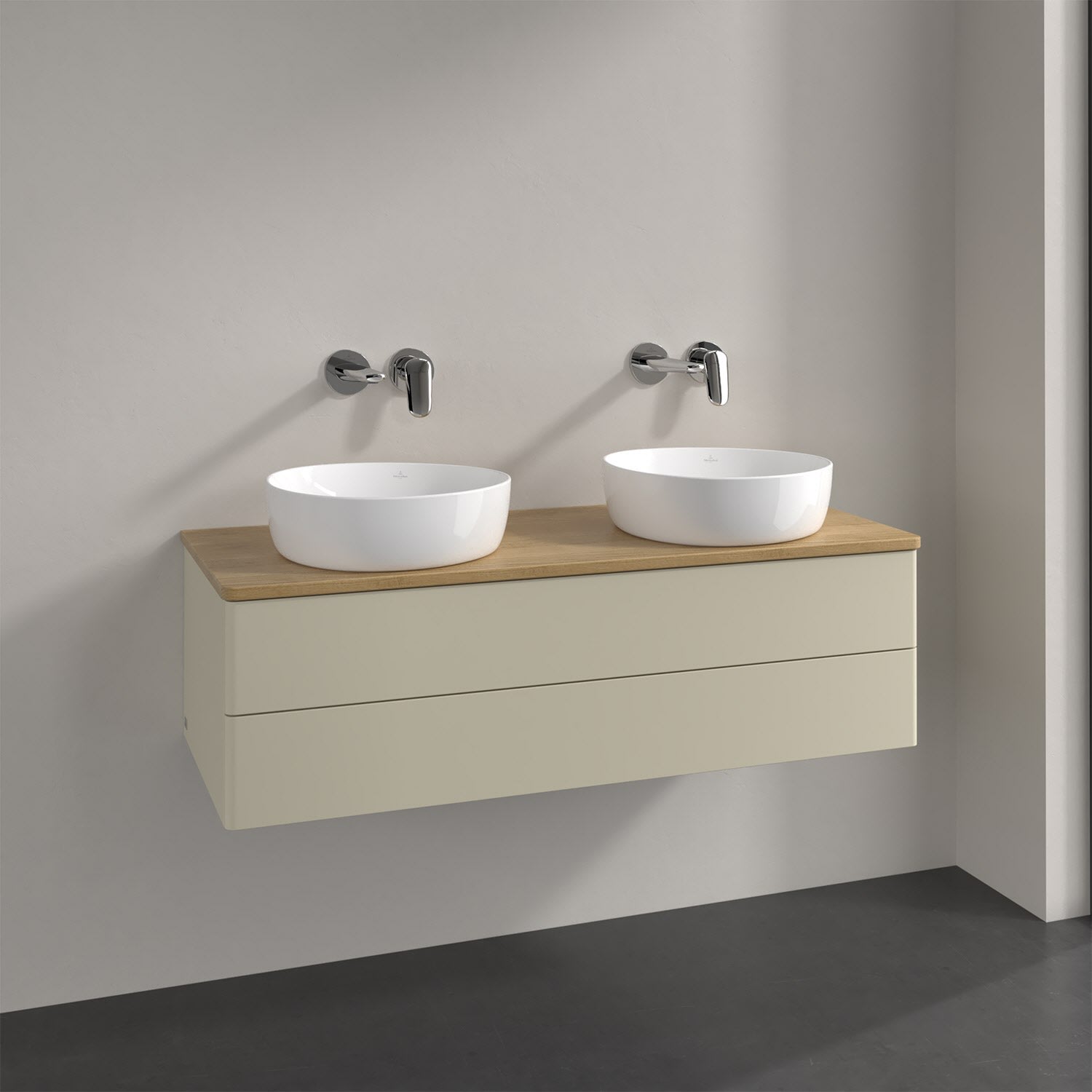 Der wandhängende Antao Waschtischunterschrank von Villeroy & Boch bietet nicht nur jede Menge Stauraum – er ist dank seines naturinspirierten Designs mit seinen abgerundeten Kanten auch noch besonders stilvoll und schafft eine gemütliche Atmosphäre im Badezimmer. Kombiniert mit zwei passenden Aufsatzwaschtischen also die ideale Wahl. Zwei geräumige Auszüge bieten viel Platz, um alles Notwendige zu verstauen und Ordnung zu halten. Öffnen lassen sie sich durch leichten Druck auf die grifflose Front. Dank Vollauszug hat man immer alles im Blick und der Antirutschboden verhindert ein Umfallen oder Verrutschen der Gegenstände. Einfach clever! Für eine besonders leichte Pflege sorgt die mehrschichtig deckend lackierte Oberfläche. Bei der Ausführung in Massivholz wird dank des verarbeiteten Massivholzes jedes Möbel zu einem Unikat, das sich durch das lebendige Naturmaterial durch seine einzigartige Struktur und Maserung auszeichnet.