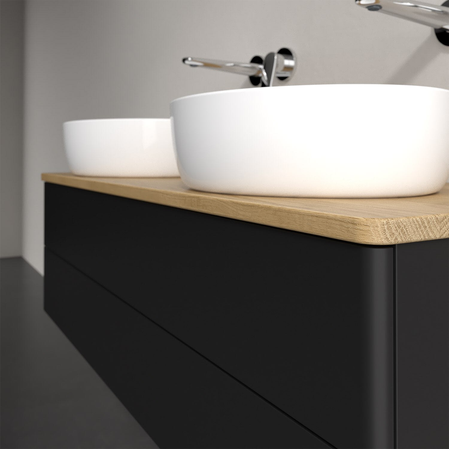 Der wandhängende Antao Waschtischunterschrank von Villeroy & Boch bietet nicht nur jede Menge Stauraum – er ist dank seines naturinspirierten Designs mit seinen abgerundeten Kanten auch noch besonders stilvoll und schafft eine gemütliche Atmosphäre im Badezimmer. Kombiniert mit zwei passenden Aufsatzwaschtischen also die ideale Wahl. Zwei geräumige Auszüge bieten viel Platz, um alles Notwendige zu verstauen und Ordnung zu halten. Öffnen lassen sie sich durch leichten Druck auf die grifflose Front. Dank Vollauszug hat man immer alles im Blick und der Antirutschboden verhindert ein Umfallen oder Verrutschen der Gegenstände. Einfach clever! Für eine besonders leichte Pflege sorgt die mehrschichtig deckend lackierte Oberfläche. Bei der Ausführung in Massivholz wird dank des verarbeiteten Massivholzes jedes Möbel zu einem Unikat, das sich durch das lebendige Naturmaterial durch seine einzigartige Struktur und Maserung auszeichnet.