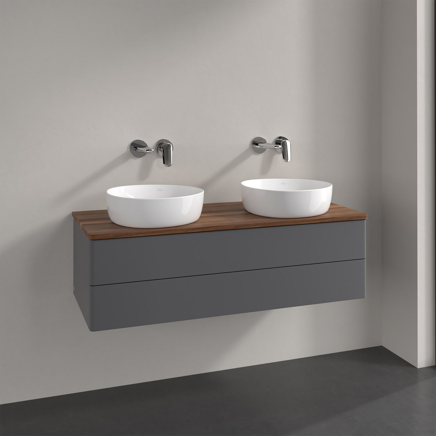 Der wandhängende Antao Waschtischunterschrank von Villeroy & Boch bietet nicht nur jede Menge Stauraum – er ist dank seines naturinspirierten Designs mit seinen abgerundeten Kanten auch noch besonders stilvoll und schafft eine gemütliche Atmosphäre im Badezimmer. Kombiniert mit zwei passenden Aufsatzwaschtischen also die ideale Wahl. Zwei geräumige Auszüge bieten viel Platz, um alles Notwendige zu verstauen und Ordnung zu halten. Öffnen lassen sie sich durch leichten Druck auf die grifflose Front. Dank Vollauszug hat man immer alles im Blick und der Antirutschboden verhindert ein Umfallen oder Verrutschen der Gegenstände. Einfach clever! Für eine besonders leichte Pflege sorgt die mehrschichtig deckend lackierte Oberfläche. Bei der Ausführung in Massivholz wird dank des verarbeiteten Massivholzes jedes Möbel zu einem Unikat, das sich durch das lebendige Naturmaterial durch seine einzigartige Struktur und Maserung auszeichnet.