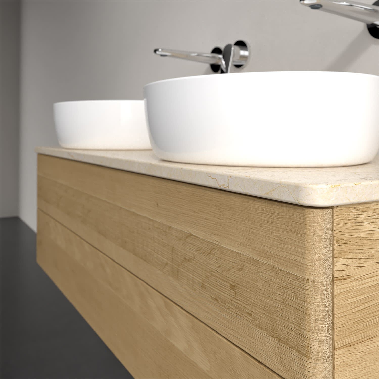 Der wandhängende Antao Waschtischunterschrank von Villeroy & Boch bietet nicht nur jede Menge Stauraum – er ist dank seines naturinspirierten Designs mit seinen abgerundeten Kanten auch noch besonders stilvoll und schafft eine gemütliche Atmosphäre im Badezimmer. Kombiniert mit zwei passenden Aufsatzwaschtischen also die ideale Wahl. Zwei geräumige Auszüge bieten viel Platz, um alles Notwendige zu verstauen und Ordnung zu halten. Öffnen lassen sie sich durch leichten Druck auf die grifflose Front. Dank Vollauszug hat man immer alles im Blick und der Antirutschboden verhindert ein Umfallen oder Verrutschen der Gegenstände. Einfach clever! Für eine besonders leichte Pflege sorgt die mehrschichtig deckend lackierte Oberfläche. Bei der Ausführung in Massivholz wird dank des verarbeiteten Massivholzes jedes Möbel zu einem Unikat, das sich durch das lebendige Naturmaterial durch seine einzigartige Struktur und Maserung auszeichnet.