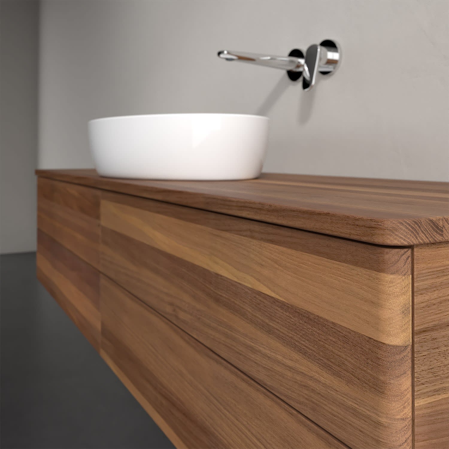 Der wandhängende Antao Waschtischunterschrank bietet mit seinen vier Auszügen und seiner erstaunlichen Größe viel Platz zum Verstauen von Utensilien im Badezimmer. Dank des mittig platzierten Aufsatzwaschtischs gibt es seitlich weiteren Platz für Handtücher, Seifenspender & Co. auf der Waschtischplatte. Inspiriert von der Natur überzeugt der Unterschrank auch optisch mit sanfter Formsprache und abgerundete Kanten. Die grifflosen Auszüge sind mit der Push-to-Open Funktion ausgestattet und verfügen über einen Antirutschboden, damit Utensilien sicher verstaut werden können. Mit seiner Vollauszug- und Selbsteinzug-Funktion ist der Schrank praktisch und leicht zu bedienen. Qualität von Villeroy & Boch! Für eine besonders leichte Pflege sorgt die mehrschichtig deckend lackierte Oberfläche. Bei der Ausführung in Massivholz wird dank des verarbeiteten Massivholzes jedes Möbel zu einem Unikat, das sich durch das lebendige Naturmaterial durch seine einzigartige Struktur und Maserung auszeichnet.