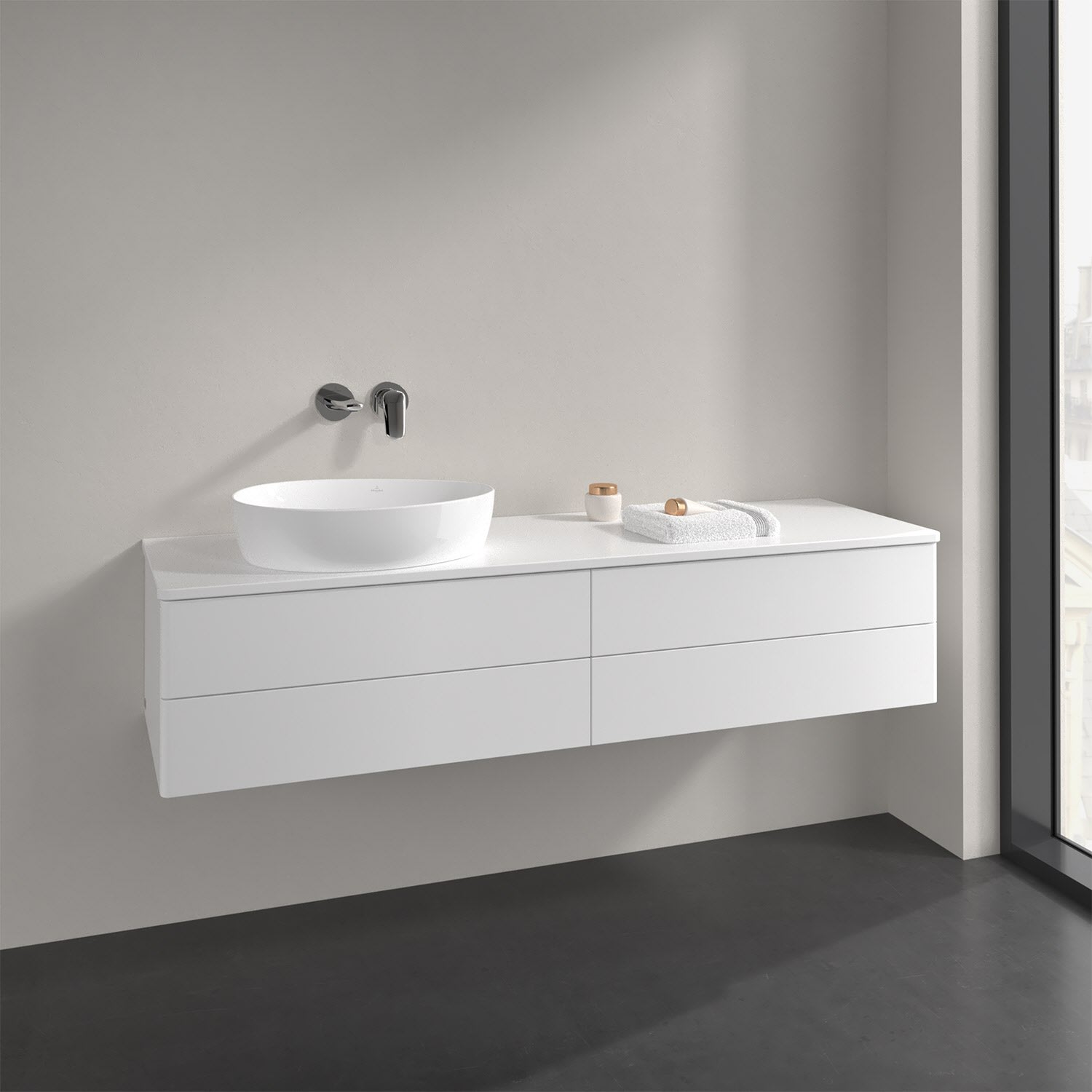 Der wandhängende Antao Waschtischunterschrank bietet mit seinen vier Auszügen und seiner erstaunlichen Größe viel Platz zum Verstauen von Utensilien im Badezimmer. Dank des seitlich platzierten Aufsatzwaschtischs gibt es daneben weiteren Platz für Handtücher, Seifenspender & Co. auf der Waschtischplatte. Inspiriert von der Natur überzeugt der Unterschrank auch optisch mit sanfter Formsprache und abgerundete Kanten. Die grifflosen Auszüge sind mit der Push-to-Open Funktion ausgestattet und verfügen über einen Antirutschboden, damit Utensilien sicher verstaut werden können. Mit seiner Vollauszug- und Selbsteinzug-Funktion ist der Schrank praktisch und leicht zu bedienen. Qualität von Villeroy & Boch! Für eine besonders leichte Pflege sorgt die mehrschichtig deckend lackierte Oberfläche.