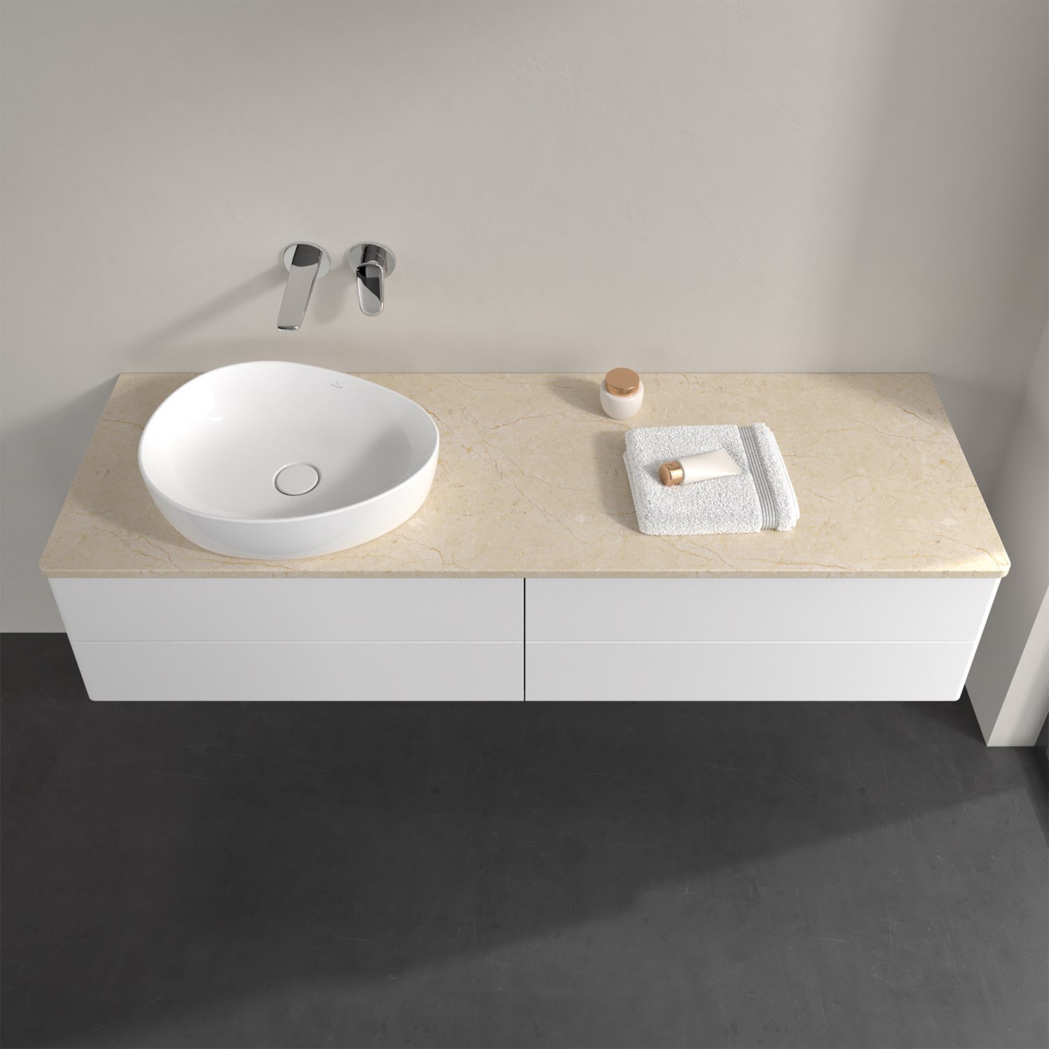 Für diesen Waschbeckenunterschrank stehen Ihnen Aufsatzwaschtische aus verschiedenen Serien zur Verfügung (siehe "Passliste" unter Downloads). Ein ausgewähltes Beispiel finden Sie im Zubehör. Den Waschtisch bitte separat mitbestellen.
