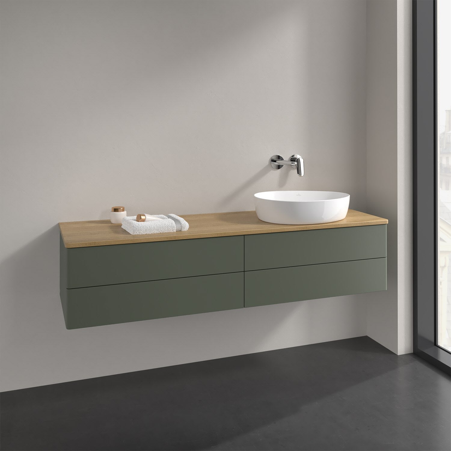 Der wandhängende Antao Waschtischunterschrank bietet mit seinen vier Auszügen und seiner erstaunlichen Größe viel Platz zum Verstauen von Utensilien im Badezimmer. Dank des seitlich platzierten Aufsatzwaschtischs gibt es daneben weiteren Platz für Handtücher, Seifenspender & Co. auf der Waschtischplatte. Inspiriert von der Natur überzeugt der Unterschrank auch optisch mit sanfter Formsprache und abgerundete Kanten. Die grifflosen Auszüge sind mit der Push-to-Open Funktion ausgestattet und verfügen über einen Antirutschboden, damit Utensilien sicher verstaut werden können. Mit seiner Vollauszug- und Selbsteinzug-Funktion ist der Schrank praktisch und leicht zu bedienen. Qualität von Villeroy & Boch! Für eine besonders leichte Pflege sorgt die mehrschichtig deckend lackierte Oberfläche. Bei der Ausführung in Massivholz wird dank des verarbeiteten Massivholzes jedes Möbel zu einem Unikat, das sich durch das lebendige Naturmaterial durch seine einzigartige Struktur und Maserung auszeichnet.