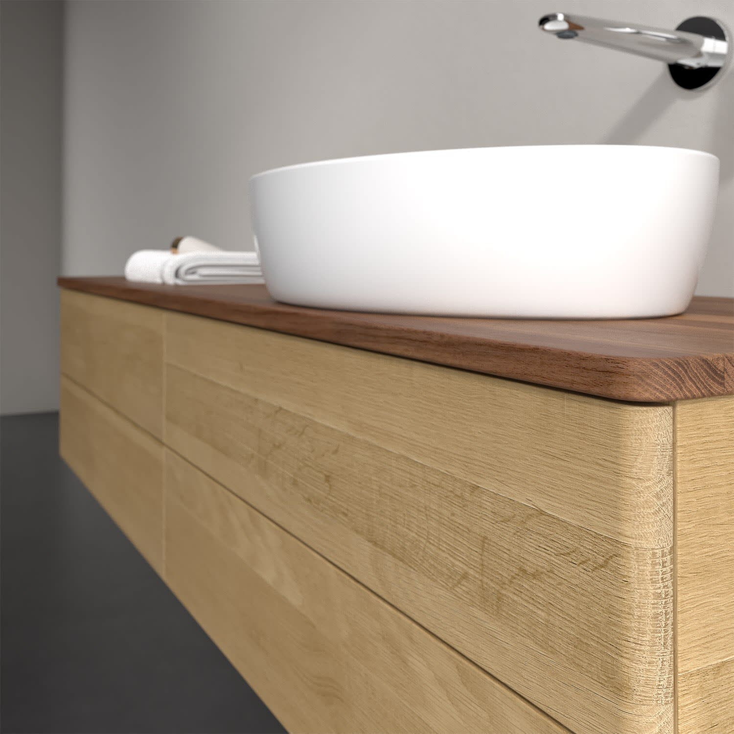 Der wandhängende Antao Waschtischunterschrank bietet mit seinen vier Auszügen und seiner erstaunlichen Größe viel Platz zum Verstauen von Utensilien im Badezimmer. Dank des seitlich platzierten Aufsatzwaschtischs gibt es daneben weiteren Platz für Handtücher, Seifenspender & Co. auf der Waschtischplatte. Inspiriert von der Natur überzeugt der Unterschrank auch optisch mit sanfter Formsprache und abgerundete Kanten. Die grifflosen Auszüge sind mit der Push-to-Open Funktion ausgestattet und verfügen über einen Antirutschboden, damit Utensilien sicher verstaut werden können. Mit seiner Vollauszug- und Selbsteinzug-Funktion ist der Schrank praktisch und leicht zu bedienen. Qualität von Villeroy & Boch! Für eine besonders leichte Pflege sorgt die mehrschichtig deckend lackierte Oberfläche. Bei der Ausführung in Massivholz wird dank des verarbeiteten Massivholzes jedes Möbel zu einem Unikat, das sich durch das lebendige Naturmaterial durch seine einzigartige Struktur und Maserung auszeichnet.