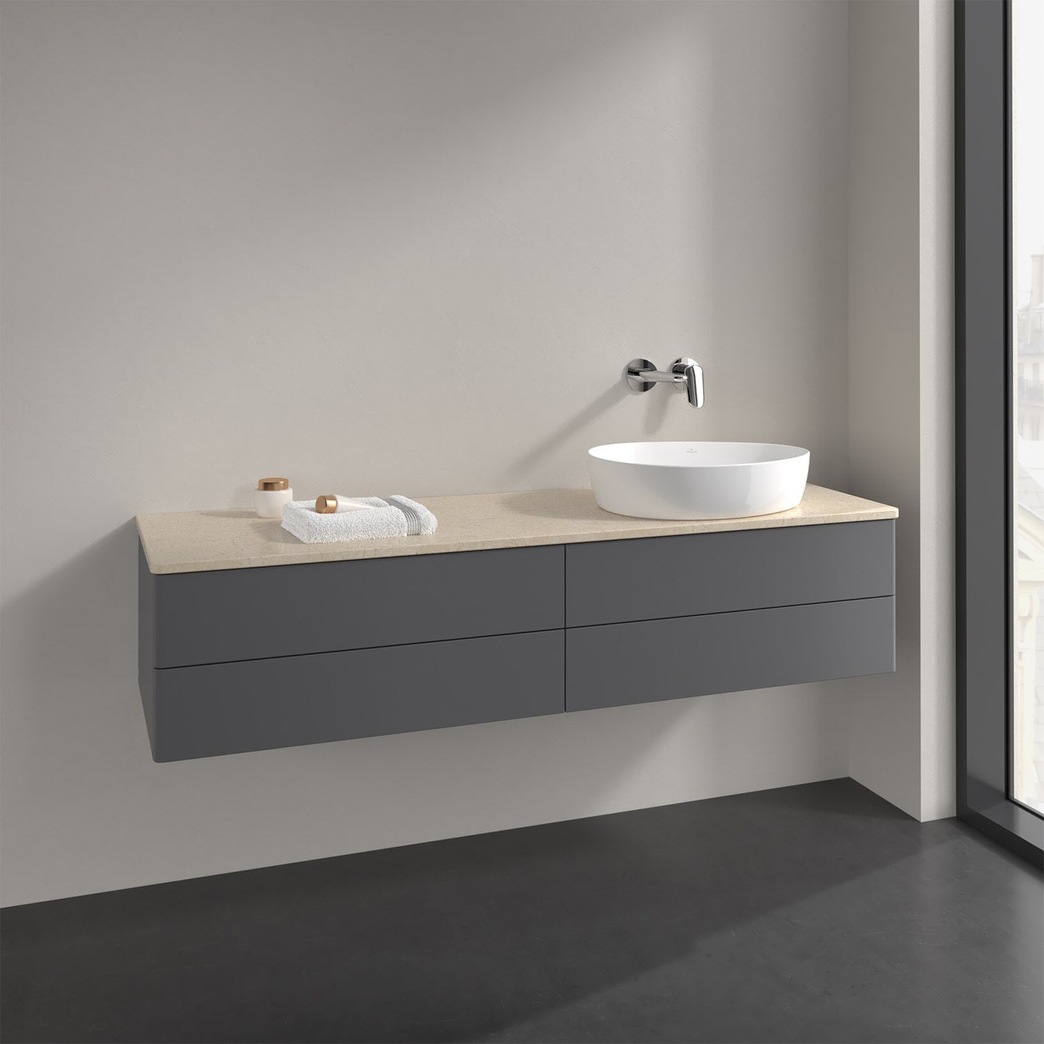 Villeroy & Boch Antao Waschbeckenunterschrank, 160 x 19 cm, 4 Auszüge, Fronten ohne Struktur, ohne Hahnloch, für Waschtisch rechts