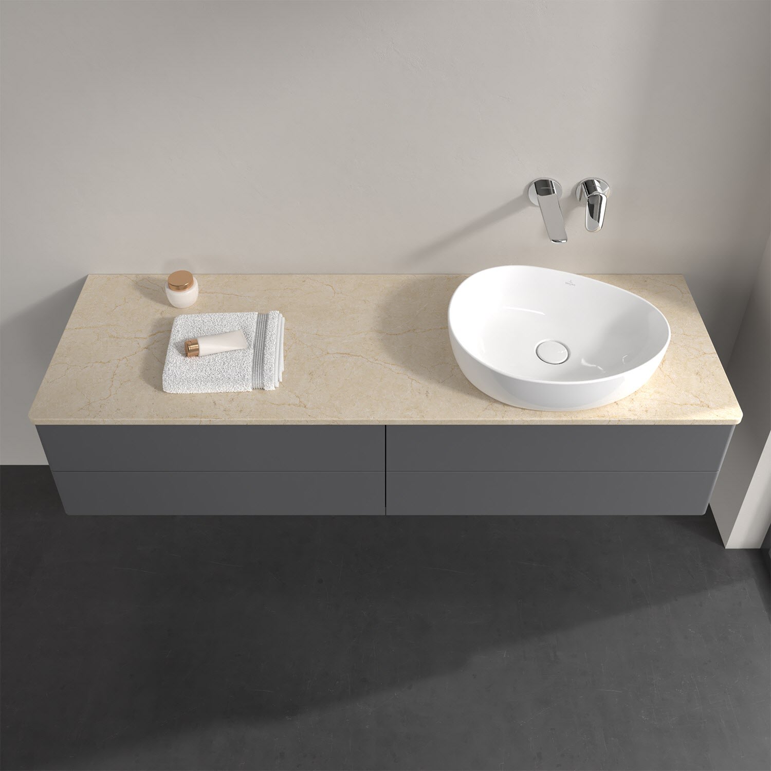 Für diesen Waschbeckenunterschrank stehen Ihnen Aufsatzwaschtische aus verschiedenen Serien zur Verfügung (siehe "Passliste" unter Downloads). Ein ausgewähltes Beispiel finden Sie im Zubehör. Den Waschtisch bitte separat mitbestellen.